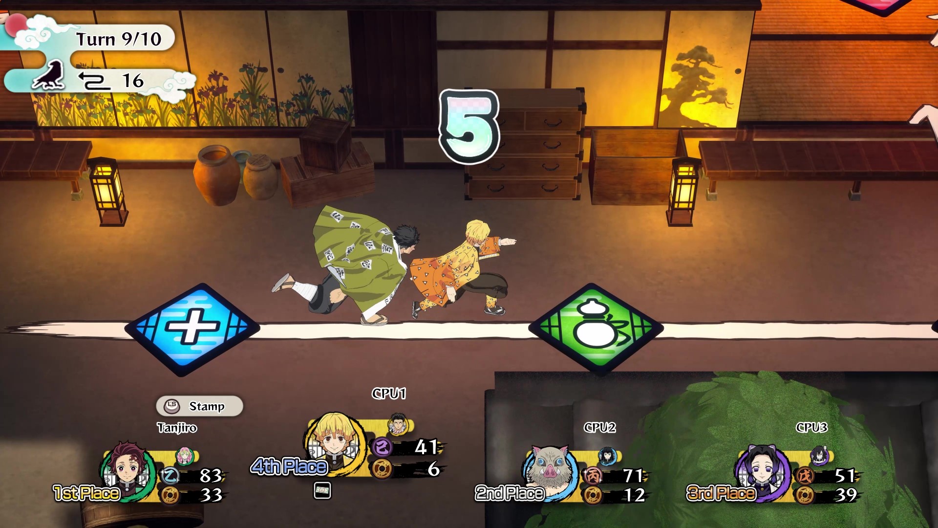 Luoghi celebri dell’anime, come il monte Fujikasane e Asakusa, diventano tavole nel gioco. Avanza tirando il dado! Sul tavoliere si alternano il giorno e la notte. Di giorno, ti prepari con eventi e minigiochi. Di notte, vai a caccia di demoni da sconfiggere. Diventa l’ammazzademoni più forte in assoluto!