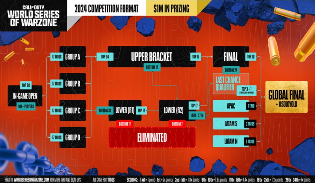 La piรน grande competizione del battle-royale Call of Duty Warzone del mondo, ossia Call of Duty World Series of Warzone, torna nel 2024, con un maggior numero di partite, con un nuovo formato per le finali, a livello globale, progettato per aumentare l’intensitร  e con un montepremi di 1 milione di dollari.ย