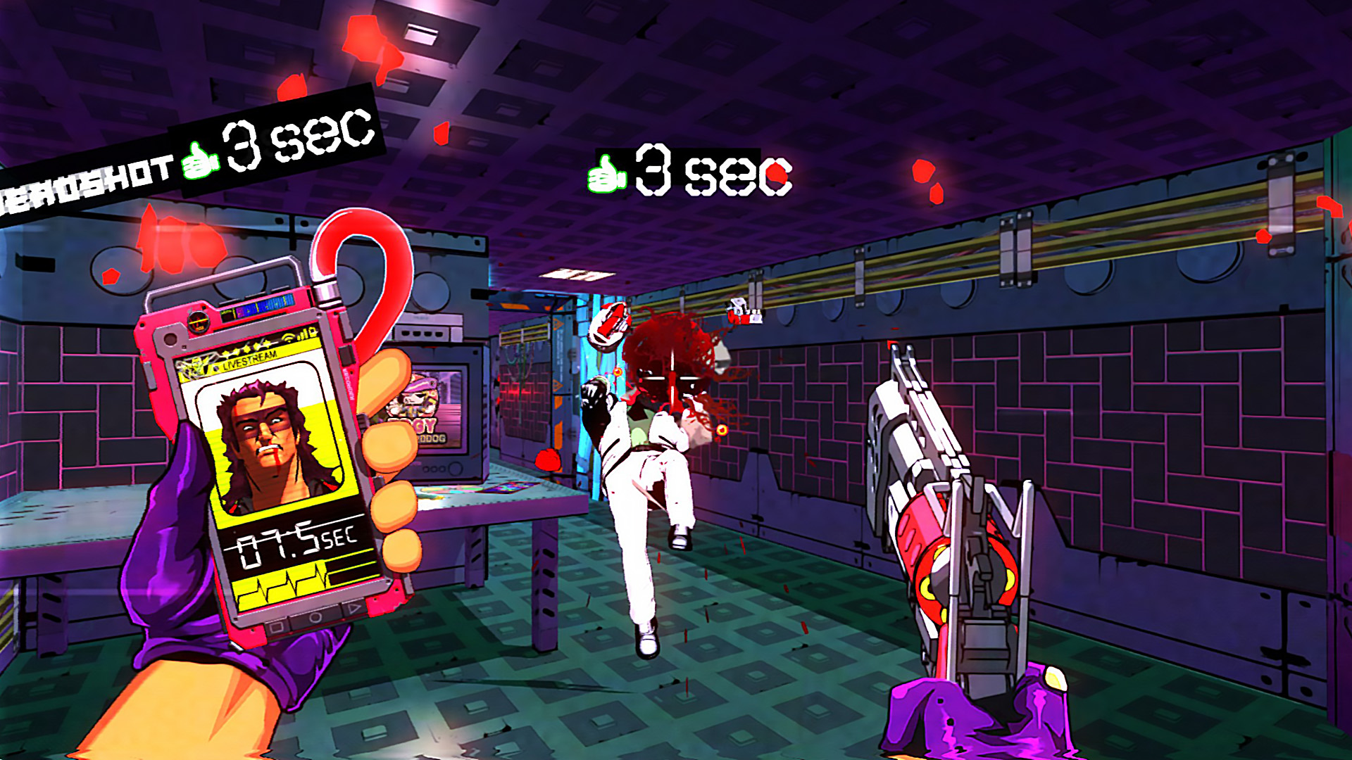 Come è facile immaginare, un simile scenario comporta un ritmo di gioco particolarmente veloce, coadiuvato da livelli incredibilmente ben progettati. Pur ritrovandoci a sparare con una moltitudine di armi da fuoco, lo scatto corpo a corpo è forse ancor più importante perché consente di spingere i nemici contro porte, ventole e finestre, provocando uccisioni tanto spettacolari quanto utili per rimpinguare il conto alla rovescia. Capiterà infatti fin troppo spesso di esaurire il tempo a disposizione per un soffio, ma per fortuna tra un piano e l’altro avremo accesso a una serie di potenziamenti che ci renderanno la vita più facile, da armi più potenti ed efficaci a modi per guadagnare secondi bonus e gestire i secondi in modo più efficace. Il mio consiglio è di aumentare il bonus per le uccisioni ambientali e sfruttare l’abilità di rallentare il tempo quando il timer è agli sgoccioli per rimontare, ma ci sono molte opzioni tra cui scegliere per chi cerca più potenza di fuoco, in perfetto stile roguelite. Eh sì, perché Mullet Mad Jack preserva lo spirito di questi ultimi generando livelli e potenziamenti casuali a ogni partita, ma, anziché farci ricominciare da zero ogni volta, il game over ci spedisce all’inizio del capitolo che stavamo affrontando, dieci in tutto, strutturati in maniera tale da diversificare nemici e ostacoli che li popolano e coronati dalla sfida contro un boss, dove per fortuna il limite di tempo viene rimosso. È una struttura interessante, che funziona molto bene grazie alle meccaniche aggiuntive che si sommano di volta in volta alle precedenti. La grafica eclettica e vivace fa il verso alle serie animate giapponesi di fantascienza degli anni 90, replicandone lo stile con maniacale dovizia di particolari, ivi compresa la tipica brutalità dell’epoca che dovrebbe fare la gioia di tutti i nostalgici.