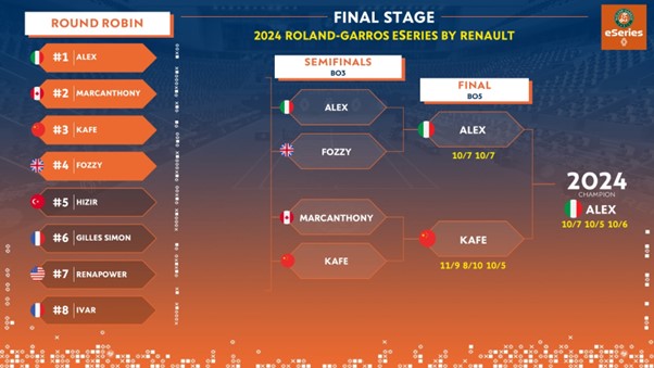 Sabato 25 maggio si è svolta la fase finale del più grande torneo di eTennis del mondo (548.000 partecipanti alle qualificazioni), che ha attirato 204.000 spettatori unici su Twitch e 200 spettatori di persona: partito come underdog, l’italiano Alessandro “ΔLEX” Bianco è stato incoronato campione del Roland-Garros eSeries by Renault 2024 sul gioco mobile Tennis Clash dopo aver sconfitto il doppio finalista e medaglia d’argento delle Olimpiadi eSport Series, il cinese Shenghao “Kafe” He. ΔLEX è riuscito a prevalere senza perdere nemmeno un set nelle 9 partite disputate.