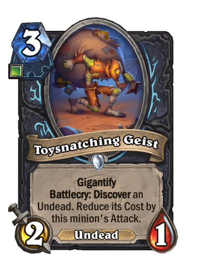 Dato che lo abbiamo citato nel paragrafo precedente, eccolo qua. Anche senza alcun buff Toysnatching Geist è già un ottimo servitore, che potresti prendere in considerazione e inserire nel tuo mazzo. Ridurre il costo di mana è sempre stato un effetto positivo in Hearthstone (e nei giochi di carte in generale ovviamente). E’ proprio per questo che il Geist è tanto interessante. Mettersi in mano un Undead potente con costo molto ridotto, con un discount pari alla forza del Geist, è facilissimo dati  i numerosi strumenti a disposizione dei Death Knights per potenziare i servitori che ha in mano. Quasi quasi, in questo quadro il fatto che la carta abbia gigantificare è quasi superfluo. Perché è la sua versione a costo 3 la più interessante da buffare e giocare in early-game. Certo, se a fine partita vi avanza un bel Geist 8/8 a costo 8…wow.