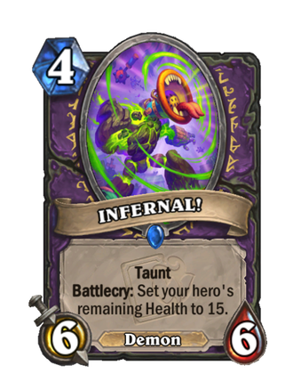 Ridurre le tue difese a quindici punti Salute è un prezzo abbastanza alto da pagare, è evidente, anche se ti fa ottenere un 6/6 con Provocazione per soli quattro mana: il temibile INFERNAL!. Tuttavia… avete pensato al fatto che esistono mazzi che VOGLIONO perdere Salute? In questo contesto sicuramente non usuale, ma possibile INFERNAL! passa dall’essere “potenzialmente giocabile” a essere indispensabile/necessario. Insomma, è un body temibile calato presto sul terreno, che supporta la strategia principale in modo efficiente. Tra i vantaggi possiamo includere la capacità di imbrogliare carte come Molten Giants molto più rapidamente; anche senza altri effetti di perdita di salute, sarai in grado di giocare un 8/8 per cinque mana nel tuo prossimo turno, perché hai “giocato” con i pinti salute e automaticamente fatto deprezzare il colosso. Oltre a ciò, puoi anche usare INFERNAL! per curarti, se la tua salute è più bassa di 15 e poi persino proteggerti con la sua abilità di provocazione. Mia signora draconica Alextraza, sei tu?