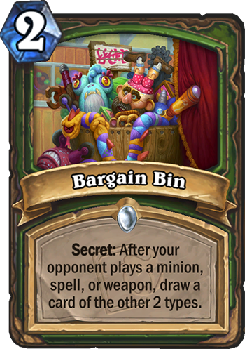 Se anche te stai giocando DI NUOVO un Secret Hunter, oltre a un portafortuna bello grande (la community online non vede di buon occhio questo mazzo, che ha terrorizzato per anni la ladder) avrai ovviamente bisogno di buoni segreti. Uno di questi è Bargain Bin, che ti fa pescare due carte dopo aver incontrato una condizione. Basta che il tuo avversario giochi una carta di un tipo (spell, servitore, arma) per farti pescare due carte dal mazzo. Nello specifico proveniente dal pool degli altri due tipi. Certo, devi giocare un mazzo con almeno alcune armi affinché il Segreto massimizzi la sua efficacia. Cioè, che garantisca due pescate in modo costante (a meno che il tuo avversario non giochi un’arma, allora pescherai due carte tra servitori e spell). Tuttavia, Oltre al fatto che Rexxar ha parecchi archi interessanti nel suo arsenale, c’è da dire che avere la possibilità di pescare due carte per due mana è di base un effetto incredibile SEMPRE. Dobbiamo spiegare perché?
