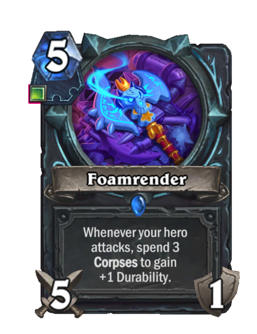 In teoria, Foamrender è un’arma che non esaurisce mai la sua Resistenza. Almeno, se si hanno modi variegati per generare Cadaveri (e se giochi la classe giusta direi che ce ne sono più che abbastanza) e si vuole essere in grado di avere una fonte permanente di cinque danni. Ci saranno occasioni in cui dovrai trattenerti dall’attaccare, certo, per non perdere questa preziosa risorsa prima del tempo. O semplicemente dovrai “inghiottire il rospo” e usare l’ultima carica che farà rompere la spada. Ma in generale, quel che è certo è che Foamrender in genere rimarrà in gioco a lungo. Poiché l’idea è questa, cioè tenerla equipaggiata a lungo, potrebbe non essere sensato inserire due copie: decidete voi. Con una sola copia di solito ci si trova più che bene.