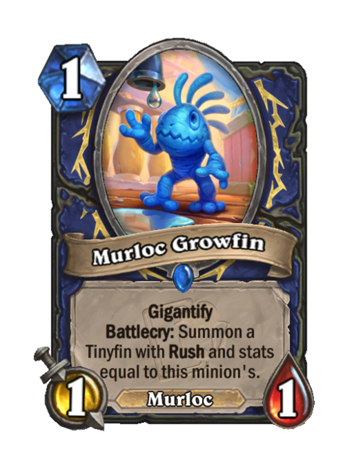 Murloc Growfin ha miniaturizzare, perciò a costo 1 ti mette in mano una sua versione più piccina che evoca una coppia di 1/1 al prezzo di una. Anche se una delle quali ha Rush, non è poi così impressionante. Ti dà una certa capacità di competere all’inizio del gioco, certo, ma più tardi la si pesca meno è efficiente. Tuttavia, nel testo di questo Murloc appare anche la nuova parola chiave Gigantify, e quella sì che dà a Murloc Growfin un sacco di flessibilità extra. Dopo la gigantificazione, il piccoletto diventa un 8/8 che evoca una sua copia con rush, tutto per otto mana. Adesso sì che si tratta di una notevole quantità di valore per una singola carta. Il Growfin ha anche un’ulteriore sinergia con Shudderblock, che triplica il suo grido di battaglia, per fornirti un 8/8 in più che male non fa mai.