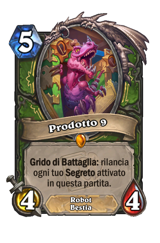 Diciamolo, forse Product 9 è quasi esageratamente forte. Specialmente perché i mazzi Cacciatori più aggressivi erano già in cima al formato Standard di Hearthstone quando è stato pubblicato questo mini-set. Senza contare che chi gioca da tempo sa quanto Rexxar sia in effetti una delle classi dominanti e più efficienti da sempre, in assoluto. Il terreno tipico per Product 9 in realtà lo abbiamo pure già nominato in un altro paragrafo di questo pezzo. A dimostrazione di quanto Blizzard sembri tenere al cacciatore particolarmente, in questa espansione alla classe sono state regalate diverse carte potentissime. Product 9, infatti, è una nuova leggendaria chiave del Secret Hunter, capace di rigiocare ogni segreto calato nel corso della partita, prima che scendesse sul terreno il dinosauretto viola (intendiamo product 9). Tutto per 5 mana e con un body 4/4? Sembra troppo bello per essere vero. Eppure lo è, e con la giusta configurazione Prodotto 9 può letteralmente inondare il tabellone di segreti e mettere alle strette ogni avversario. Anche se ovviamente si perde l’effetto sorpresa e l’oppo saprà di quali segreti si tratta (supponendo che abbia prestato attenzione alla partita). Comunque, metterne così tanti contemporaneamente sul tabellone può indurre in errore, o generare una catena di risposte automatiche talmente forti che la resa resta l’unica opzione.