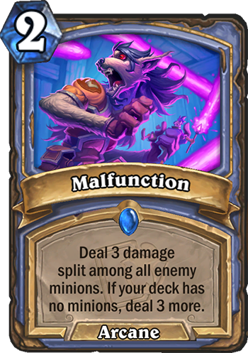 Spell Mage era già un archetipo abbastanza potente e utilizzato/utilizzabile prima del rilascio di Incredibli Invenzioni del Dr. Boom. Ultimamente però era lungi dal dominare il meta. Tuttavia, Malfunzionamento gli fornisce un’arma in più per il suo vasto arsenale magico, che aiuta a sostenere uno dei suoi punti deboli più significativi. Prima, infatti, questi mazzi faticavano all’inizio del gioco. Cioè rischiando sempre di non arrivare al punto della curva di mana dove far “brillare” le proprie potenzialità (e i punti vita del nemico). In questo campo, Malfunzionamento è estremamente utile contro i mazzi che cercano di metterti a dura prova rapidamente, evocando una flottina di piccoletti fastidiosi. I suoi sei danni (non solo 3 perché consideriamo il beat use in mazzi Mage zenza minion) uccideranno la maggior parte dei frequentatori dei tabelloni in early-game, permettendoti di sopravvivere finché non potrai giocare le tue carte più potenti di metà e fine gioco.