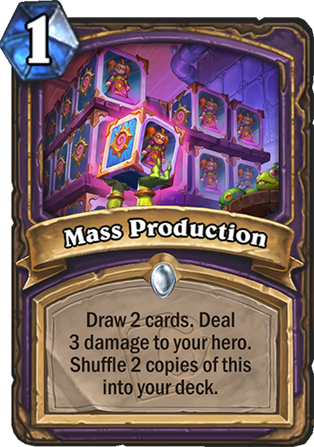 Produzione di massa è comune. Solo comune. Eppure, è di sicuro la carta migliore del set a mani basse, bassissime. Pescare due carte per un mana è già un ottimo affare, non importa quanta salute devi pagare per farlo. Comunque, il costo di tre punti salute è estremamente basso per quell’effetto. In passato abbiamo visto molto di peggio per molto di più. E soprattutto, per quanto poco sia fa comunque gioco nei mazzi che vogliono farsi del male (come Pain Warlock) di cui abbiamo parlato prima con INFERNAL!. Blizzard, parliamoci chiaro: quei 3 danni dovevano essere un contraltare negativo? Perché no, non lo sono. Ma poi, una volta agito, quindi dopo aver fatto pescare, Produzione di massa crea persino due copie di sé stesso e ce le piazza nel mazzo. Giusto per essere sicuri che l’abilità innata dello stregone, pescare 1 a costo 2 e facendoci 2 danni, diventi ridicola e inutilizzata. Beh, non sappiamo davvero che altro dire: è semplicemente una carta davvero eccellente!