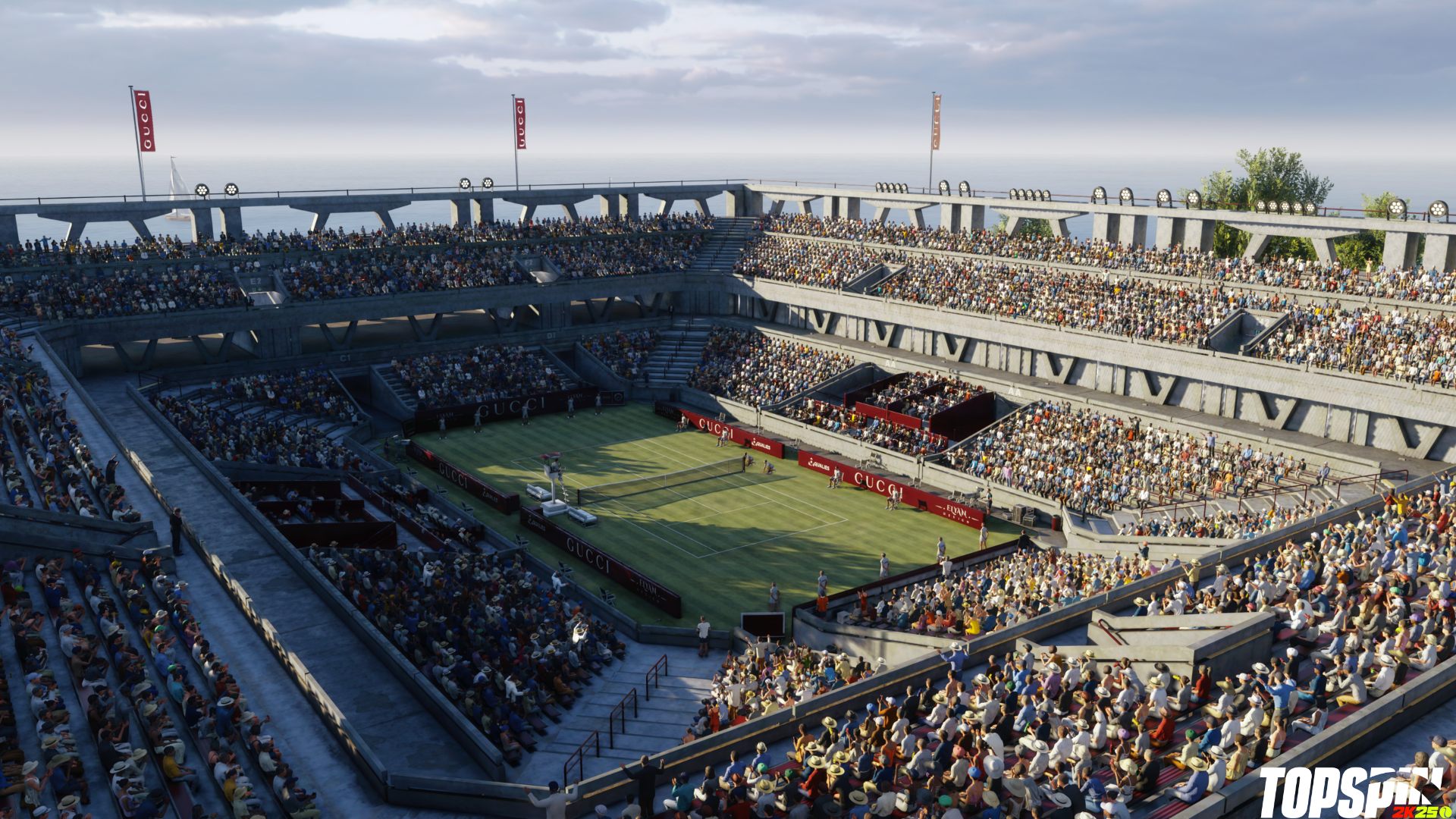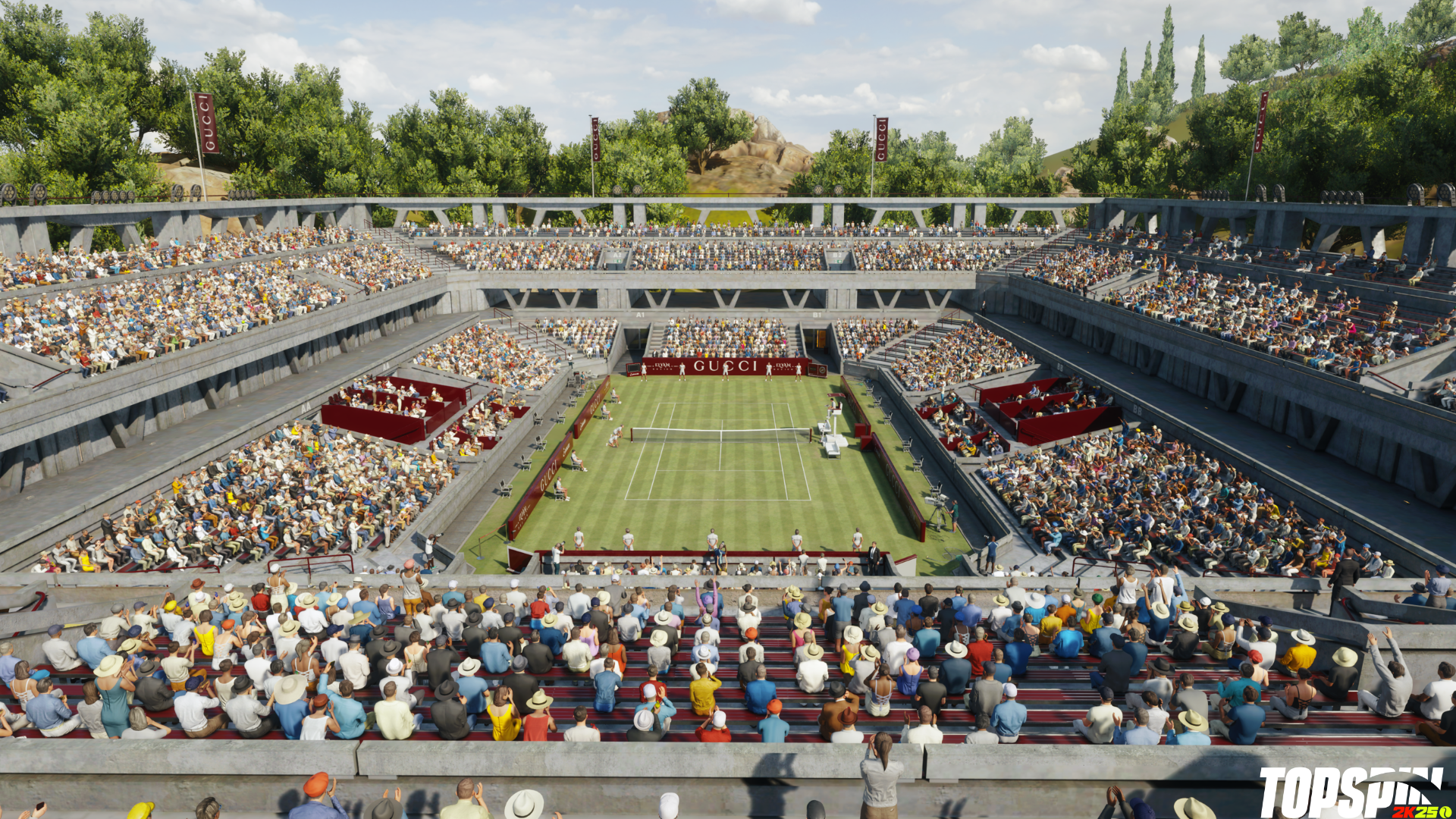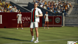 Oltre all’abbigliamento Gucci e a Jannik Sinner giocabile, TopSpin 2K25 introdurrà anche il G-Court a tema Gucci, disponibile dal 20 giugno e gratuito per tutti i giocatori. Il G-Court è un nuovo campo in erba dal design originale brandizzato Gucci che si trova in Italia, creato in collaborazione con Gucci appositamente per TopSpin 2K25. Questo campo sarà disponibile per un periodo limitato nella modalità