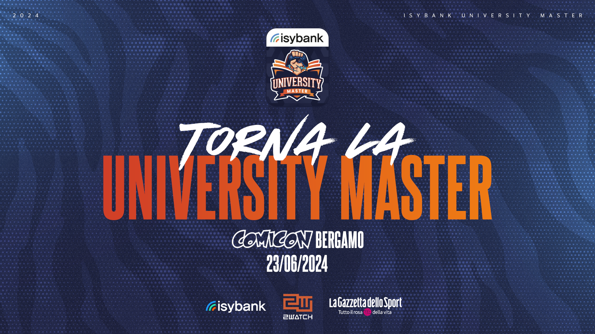Giunta quest’anno alla sua quinta edizione, verrà presentata con le sue novità in anteprima assoluta direttamente dal palco del Comicon di Bergamo, domenica 23 giugno: per l’occasione, direttamente dal palco principale del padiglione gaming, 2WATCH darà vita a “isybank University Master gaming party”: due ore di puro divertimento e intrattenimento, durante le quali si alterneranno anche le sfide ai videogiochi Clash Royale, Rocket League e Nba2K, il tutto in diretta streaming sui canali TikTok e Twitch degli organizzatori. Durante lo spettacolo, i principali content creator dei rispettivi videogiochi si sfideranno in game show coinvolgenti e interattivi. Oltre ai videogiochi, i creator coinvolgeranno il pubblico in sfide a pallacanestro, calcetto e tanto altro.