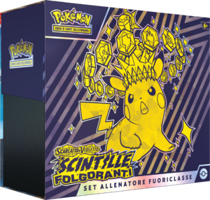 Scarlatto e Violetto – Scintille Folgoranti porta con sé Pokémon-ex Teracristal Astrali ancora più straordinari, incluso Pikachu-ex con il suo potentissimo attacco, Fulmine di Topazio. In questa espansione, i giocatori possono collezionare e giocare con carte ispirate al Bioterarium, un paradiso artificiale introdotto originariamente nell’espansione Il tesoro dell’Area Zero Parte II: Il disco indaco per i videogiochi Pokémon Scarlatto e Pokémon Violetto; potranno inoltre scoprire l’imponente Exeggutor di Alola-ex nella sua forma Astrale insieme ad altri Pokémon di tipo Drago. In più, ad attendere i giocatori vi sono anche Latias-ex e Archaludon-ex nonché nuove carte ASSO TATTICO, che continuano a movimentare le strategie del GCC Pokémon.
