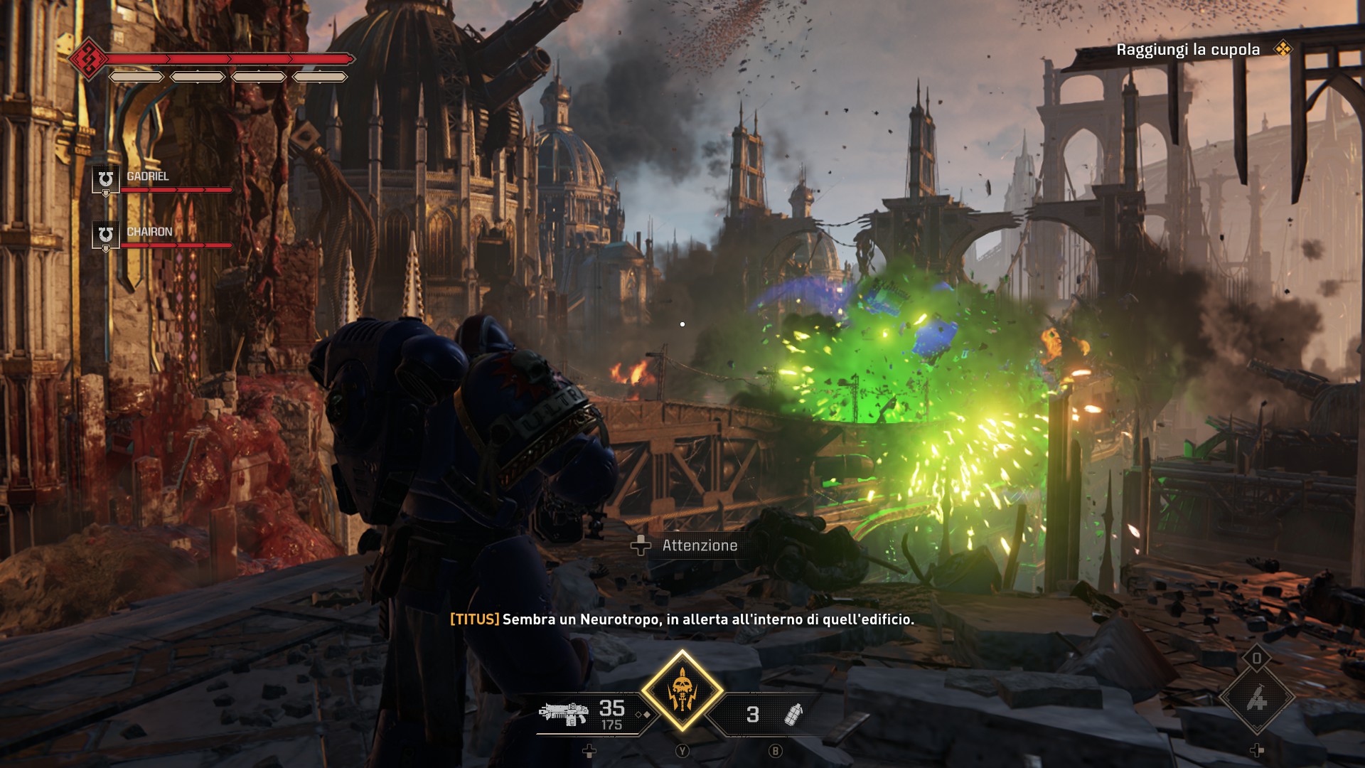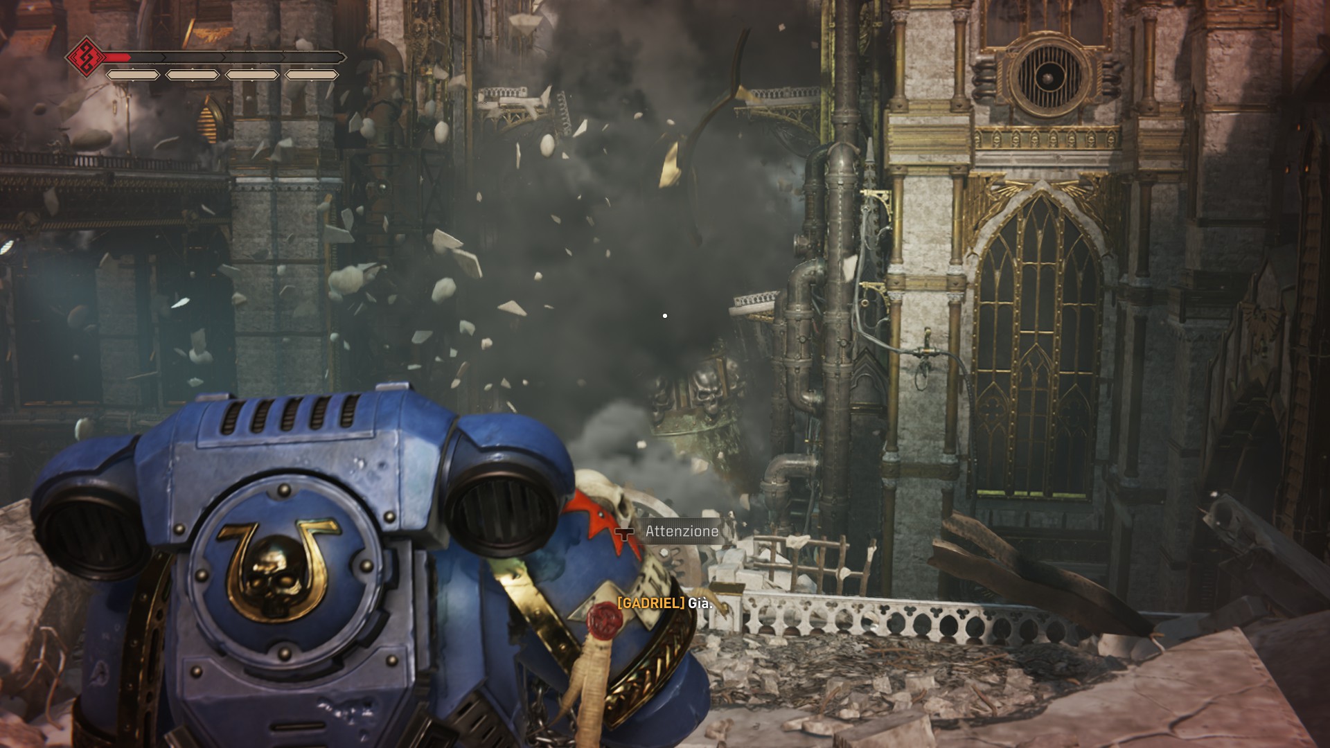 Come accennavo prima, Warhammer 40,000 Space Marine 2 è un TPS classico e riconoscibilissimo. Prende le caratteristiche del genere, le spalma al suo interno e, infine, crea una sinergia di elementi perfettamente riuscita, capace di tenere incollata e non lasciare più. È quanto accaduto a noi mentre vivevamo le peripezie dell’Ultramarine per eccellenza di cui sopra, incontrando una struttura di gioco imponente e ben implementata al suo interno, arricchita inoltre da un filo conduttore capace di unire un’avventura spensierata, davvero spensierata, che scatena una violenza senza fine. La visuale, posta alle spalle del personaggio, permette di orientarsi nel mondo di gioco. È un’avventura in realtà piuttosto lineare, comunque ricca di moltissimi dettagli e da innumerevoli situazioni che ci hanno coinvolto inaspettatamente, nel lungo corso della campagna principale. Intanto, Titus sarà armato di tutto punto, certo, ma non dall’inizio: avrà una spada rotante normalissima, una pistola e un mitragliatore qualunque per avanzare nell’avventura. Il bello, quello reale e tangibile, arriva dopo: mentre si percorre la strada, infatti, Titus si ritrova ad affrontare creature di qualsiasi tipo. Certo, qualcuno potrebbe pensare che si tratta di una reinterpretazione di un Gears of War qualunque, come di un qualunque altro TPS, eppure Warhammer 40,000 Space Marine 2 è l’essenza stessa del franchise espressa in modo coinvolgente. Intanto, per chi passa da qua per la prima volta, deve sapere che un TPS, esattamente come gli FPS, prende alla lettera la filosofia del “Sparare a qualunque cosa, pure a quella che non si muove”. Ecco, diciamo che abbiamo usato questo approccio per tutta l’esperienza, spesso confondendo chi avevamo davanti a causa delle situazioni caotiche che capitavano nel raggio di chilometri. Ammettiamo comunque che è stato fantastico entrare nel vivo dell’azione.