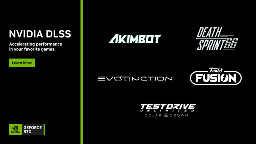 NVIDIA ha annunciato che, EVOTINCTION, Funko Fusion e Test Drive Unlimited Solar Crown arriveranno al day one con il support al DLSS 3. Inoltre, Akimbot รจ in arrivo con DLSS 3 e DeathSprint 66 arriverร  questa settimana con il supporto al DLSS Super Resolution.