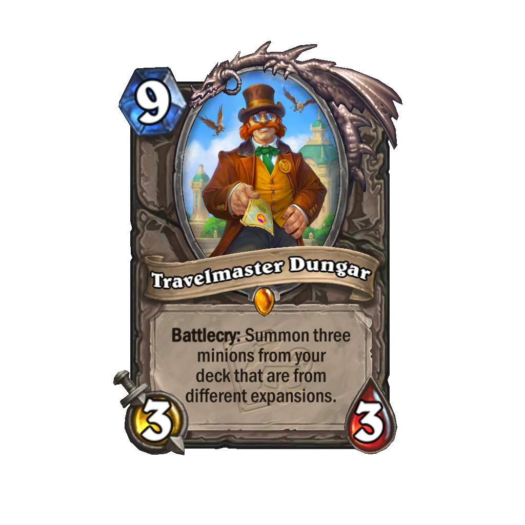 • Maestro di Viaggi Dungar: ha volato per il mondo alla ricerca di clienti per l’Agenzia di Viaggio Girovaga. Quando viene giocato, vengono immediatamente evocati tre servitori di diverse espansioni.