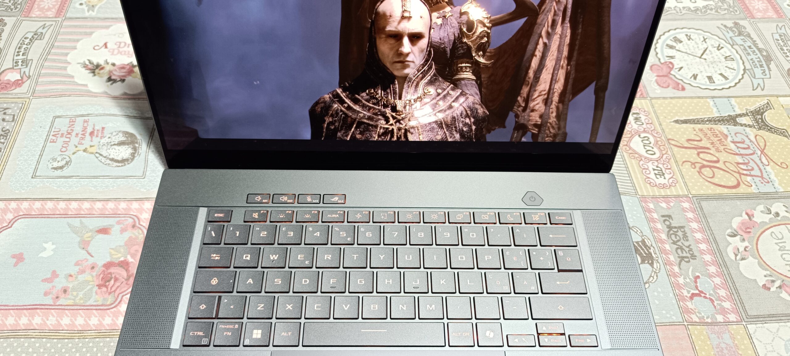 La webcam FHD del Zephyrus G16 presenta una qualità video sorprendentemente buona, con colori vivaci e dettagli nitidi, rendendo le videoconferenze un’esperienza piacevole anche grazie alla tecnologia di cancellazione del rumore AI integrata nei tre microfoni, che assicura un’ottima chiarezza vocale indipendentemente dalla rumorosità dell’ambiente in cui ci troviamo. La configurazione di Windows Hello è stata rapida e senza intoppi, consentendo un accesso sicuro e immediato al dispositivo tramite riconoscimento facciale, ma l’assenza di un otturatore fisico per la webcam potrebbe preoccupare gli utenti più attenti alla privacy, per quanto sia sempre possibile disattivare digitalmente la periferica. Il sistema audio del Zephyrus G16, dotato della tecnologia Smart Amp e Dolby Atmos, si traduce in un’esperienza audio avvolgente. I quattro altoparlanti, posizionati strategicamente ai lati della tastiera, producono un suono chiaro e potente, con bassi ben definiti e alti nitidi e puliti. Sebbene il sonoro integrato sia più che sufficiente per la maggior parte degli utenti, gli appassionati di audio sapranno di certo apprezzare la certificazione Hi-Res, che consente di collegare cuffie di alta qualità per una resa acustica ancora più immersiva.