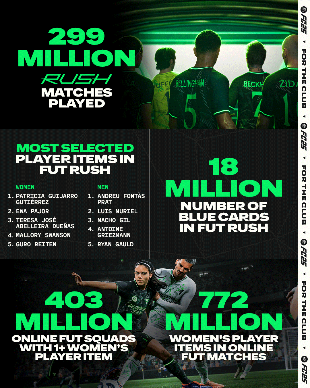 Introdotta per la prima volta in EA SPORTS FC 25, l’esperienza Rush 5v5 ha contribuito in totale a quasi 300 milioni di partite Rush giocate, con oltre 277 milioni di partite disputate nella Nike Air Zoom Arena, uno stadio digitale esclusivo per le partite Rush in Ultimate Team e Club. In Ultimate Team Rush, Andreu Fontàs Prat e Patricia Guijarro Gutiérrez sono stati rispettivamente i giocatori e le giocatrici più selezionati. Con il suo posizionamento fluido, le funzionalità di gioco social e l’integrazione perfetta in tutte le modalità principali di FC 25, Rush offre un nuovo modo di giocare e vincere insieme agli amici.