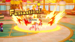 Avete presente quei momenti in cui combattete un boss e vi sembra che manchi qualcosa? Ecco, in Fraternauti alla Carica questa sensazione svanisce grazie a una trovata ingegnosa: le intuizioni di Luigi. Il nostro tubista in verde, oltre ad essere un esperto saltatore, si rivela anche un vero genio tattico che, di fronte agli antagonisti più coriacei, coglie sempre l’opportunità di mettere alla prova la sua mente geniale per trovare soluzioni inusitate. Tanto per fare un esempio, mentre combattevo uno dei contendenti di fine capitolo, il trambusto della mischia ha provocato la caduta di un paio di ventilatori sul campo di battaglia. Con un semplice comando, ho messo in moto un’intuizione di Luigi e quest’ultimo ha pensato bene di sfruttare una lunga propaggine del mostro per scaraventarlo proprio in mezzo ai violenti getti d’aria, gettandolo in confusione per un paio di turni che mi sono tornati utili per infliggergli qualche critico ben assestato. Questa meccanica non solo aggiunge profondità al gameplay, ma rende i combattimenti più divertenti e imprevedibili, un po’ come assistere a un cartone animato interattivo dove Luigi, con la sua faccia da “eureka”, trova sempre una soluzione originale per sconfiggere i nemici. Oltre a fornire una caratterizzazione ben distinta al fratello di Mario, i suoi processi deduttivi vengono impiegati anche per evidenziare interazioni particolari con gli scenari, che spaziano dalla raccolta di monete mediante distruzione di oggettistica assortita al riconoscimento di particolari elementi grazie ai quali poter proseguire.