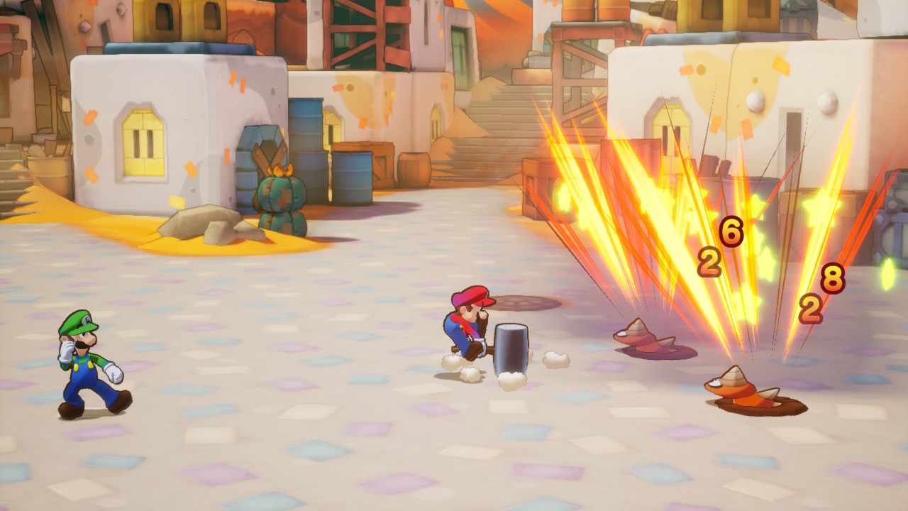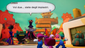 Dopo il tripudio cartaceo di Paper Jam, è facile sentirsi un po’ spiazzati di fronte al nuovo capitolo della saga, che presenta una grafica in cel-shading molto curata ma tutto sommato abbastanza ordinaria. L’impatto visivo iniziale non è altrettanto clamoroso, manca quel tocco di originalità che avevo adorato nel predecessore, ma non lasciatevi ingannare dalle prime impressioni: Fraternauti alla Carica ha davvero tantissimo da offrire. Lo stile animato delle cutscene è un vero e proprio tripudio di energia, perfetto per catturare lo spirito dei due fratelli. Le espressioni esagerate e le animazioni estremamente fluide creano una miscela esplosiva che si traduce in esplorazioni e combattimenti divertentissimi. Ogni mossa, ogni salto, ogni interazione con l’ambiente è un’occasione per mettere in scena una gag o una situazione comica diversa.
