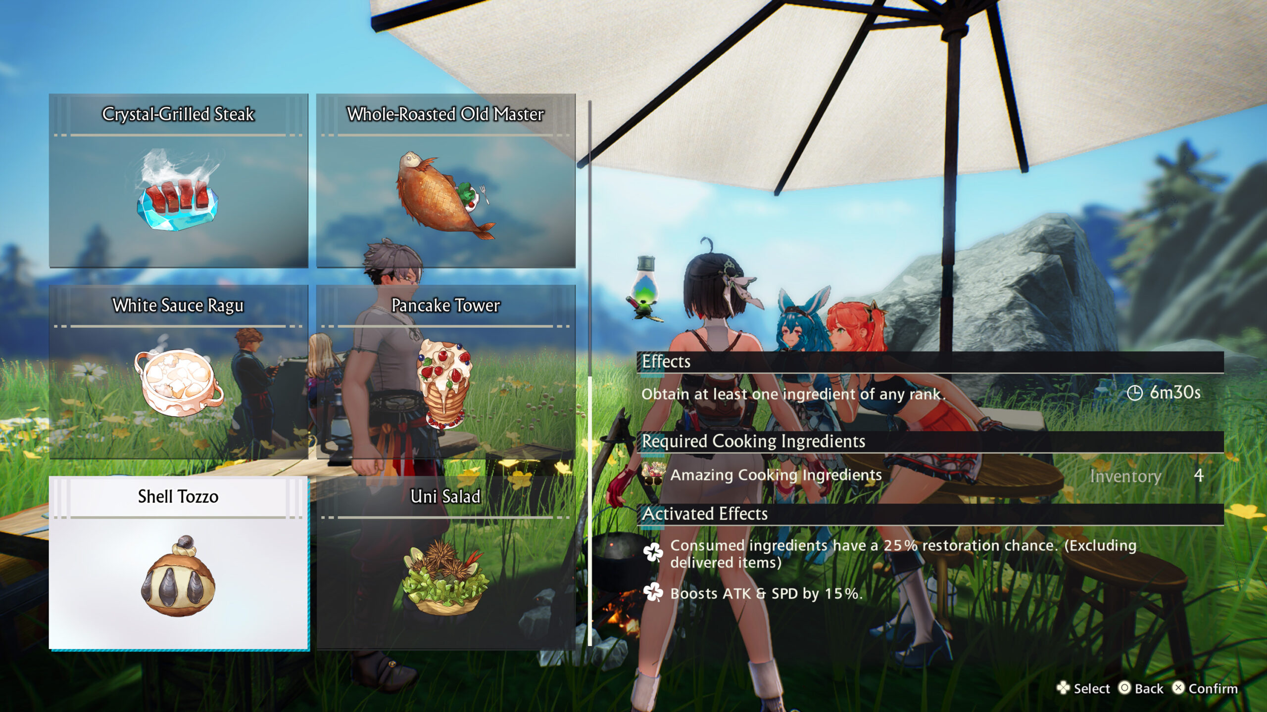 Infine, se i giocatori non desiderano tornare alla loro base durante l’esplorazione, potranno allestire un accampamento dove trascorrere il tempo cucinando, che fornirร  vari vantaggi durante l’esplorazione e il combattimento, o riposando. A volte si verificheranno alcuni eventi del personaggio che si possono vedere solo negli accampamenti e che forniscono maggiori informazioni su Yumia e i suoi compagni.