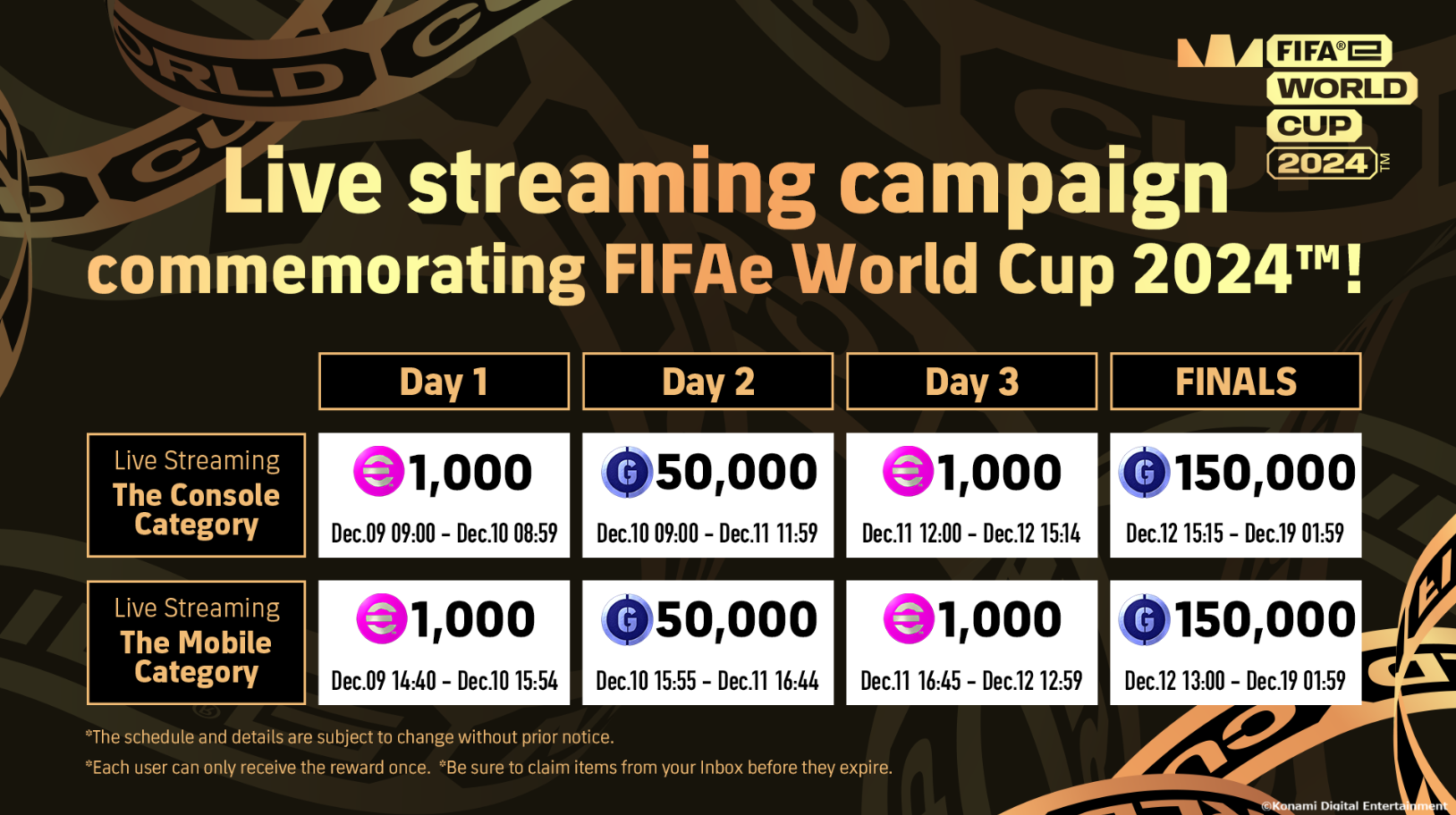 KONAMI celebrerà la FIFAe World Cup 2024 con una campagna eFootball, portando in-game lo spirito del torneo. Sintonizzandosi sullo streaming ufficiale della FIFAe World Cup 2024™, dal 9 al 12 dicembre, gli utenti potranno usufruire di bonus giornalieri e sbloccare fino a un massimo di 4.000 punti eFootball e 400.000GP. Si tratterà di una vera e propria sfida ai vertici, con i giocatori più talentuosi che si sono affrontati nei turni di qualificazione in-game durante le selezioni nazionali.