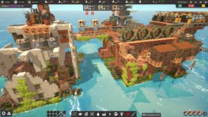 Dalla schermata è possibile gestire ogni elemento facilmente per costruire lo scenario. Il debito concettuale con Minecraft è evidente, ma del resto il grande classico ha fatto scuola, e questa scelta “maistream” lo rende ancora più accattivante. Le similitudini non si fermano a quelle di gameplay, l’immortale opera ideata dallo sviluppatore svedese Markus Persson, infatti, si possono notare, pur con le dovute differenze, anche dal lato puramente audiovisivo. Chiaramente le texture dei modelli poligonali non sono composte da pochi pixelloni giganti, ma appaiono anzi armoniose e visivamente molto gradevoli, ma l’aspetto “derivativo” è abbastanza evidente. Le animazioni dei personaggi in scena, di tre tipi, Ingegneri, Marinai e Operai, sempre monitorabili grazie alle comode info grafiche iconiche, e degli elementi costruibili, sono ben realizzate, specie nel caso dei disastri, con onde mosse e fumo molto credibili. Saper manovrare una gru si rivela una skill utilissima! Il titolo offre anche degli interessanti pop-up con illustrazioni realizzati in stile cartoon ben armonizzati con il resto del comparto grafico, ed ottimi effetti di variazione giorno/notte, che regalano una buona varietà al titolo aiutando a misurare il tempo di gioco.
