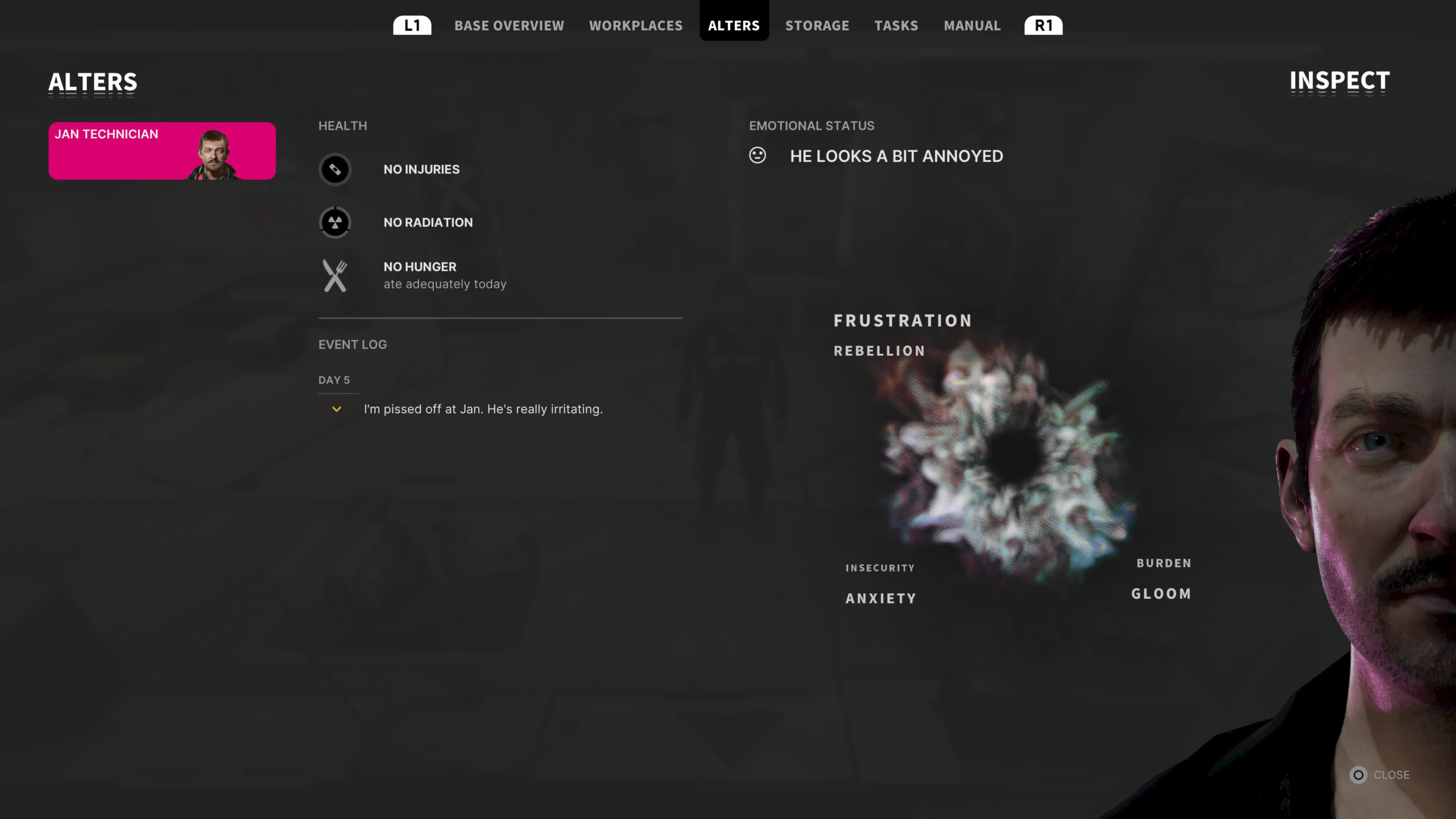 Quindi, oltre a dover tenere conto di risorse in rapido esaurimento e dellโ€™incombente minaccia di unโ€™alba radioattiva che decreterร  la nostra fine, a noi il compito di mediare tra Jan โ€œcloniโ€, ma non per questo meno umani e reali. In una delle apposite schermate infatti potremo pure tenere traccia dei tratti caratteriali e umorali oltre che a rivedere un log con le nostre interazioni piรน recenti: frustrati, ribelli, divertiti o collaborativi. Improvvisarci responsabili HR, unico vero indelegabile compito del gioco.