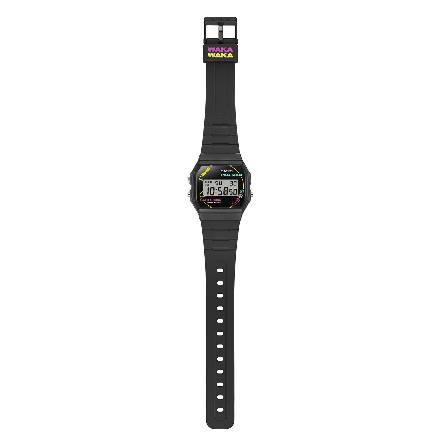 I modelli A168WEPC e F-91WPC integrano PAC-MAN e i quattro FANTASMI (Blinky, Inky, Clyde e Pinky) in una cassa accattivante con dettagli in accese tonalitร  neon, che conferiscono ad entrambi gli orologi un tocco pop. Il suono che PAC-MAN emette quando mangia i Cookies โ€” โ€œWAKA WAKAโ€ โ€” รจ riportato sulla fibbia del modello A168WEPC e sul display LCD (una volta illuminato), oltre che sul passante del cinturino dellโ€™F-91WPC, aggiungendo un elemento divertente. I quadranti degli orologi ABL-100WEPC e CA-53WPC richiamano uno dei livelli del gioco, riportando la schermata del labirinto, popolato dai noti personaggi. Il modello ABL-100WEPC viene presentato in versione total black, come tributo allo schermo monocromatico del videogioco, con la scritta โ€œPAC-MANโ€ incisa sulla chiusura del cinturino. Il CA-53WPC, invece, utilizza una cassa gialla per ricordare lโ€™aspetto di un cabinato arcade.