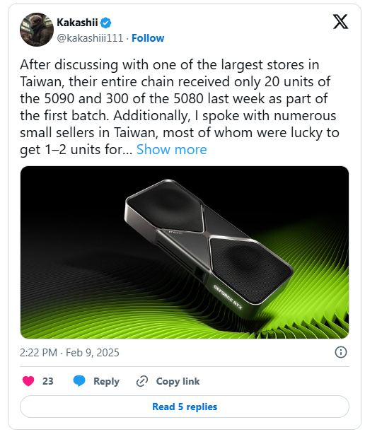 Se volete avere un’idea della situazione della catena di fornitura, un’analisi dell’utente X @kakashiii111 afferma che Taiwan รจ riuscita a ricevere solo meno di 100 unitร  di RTX 5090, e stiamo parlando di un mercato significativo per NVIDIA. La situazione รจ simile in tutte le regioni, dato che i rivenditori hanno riportato scorte a singola cifra per la GPU RTX Blackwell, fiore all’occhiello di NVIDIA. Il Team Green non รจ attualmente in grado di controllare la situazione della domanda e dell’offerta e, in base alle nostre stime, ci aspettiamo che la situazione si raffreddi dopo alcuni mesi.