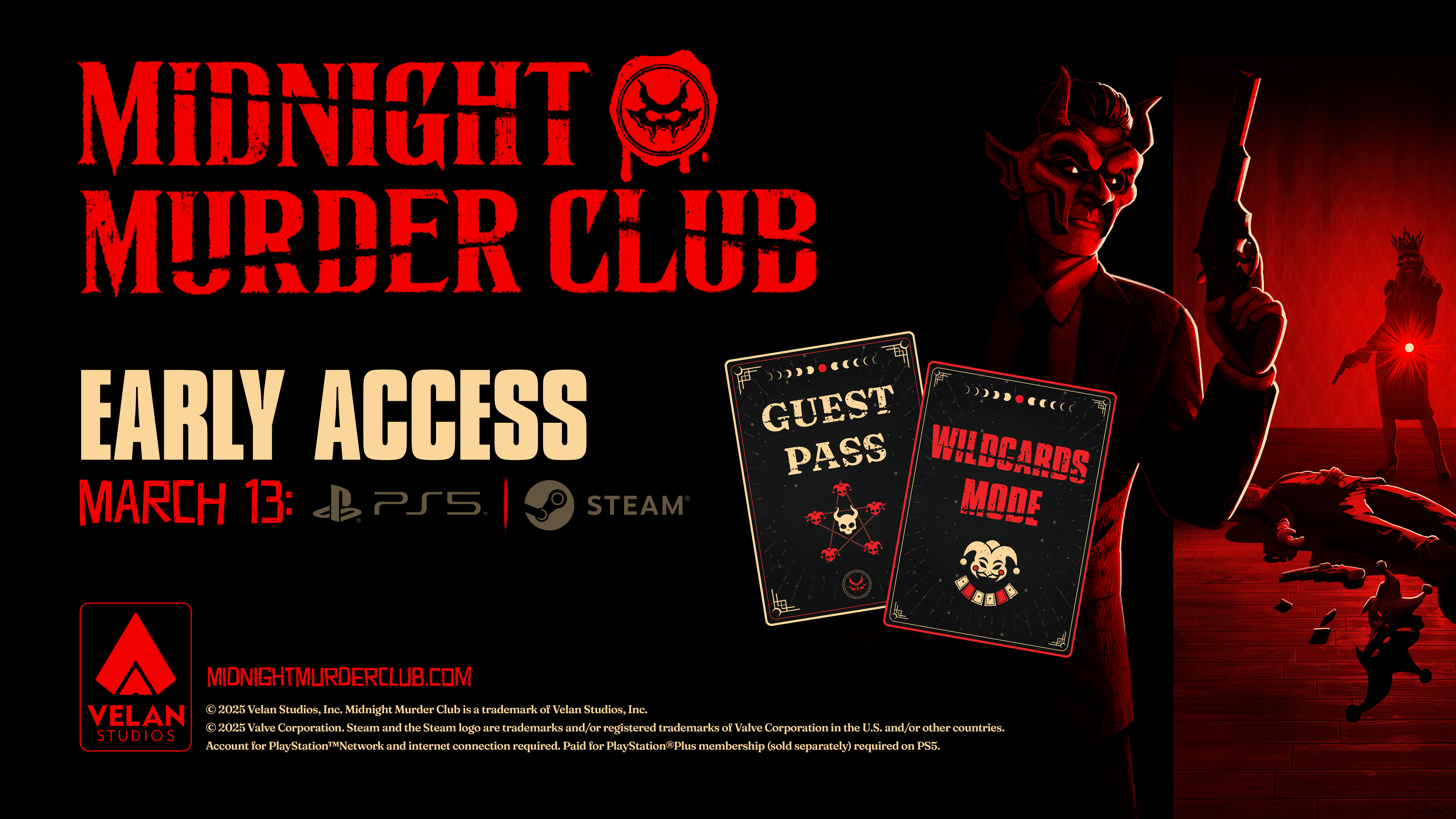Velan Studios ha annunciato, tramite un video sul proprio canale YouTube, il lancio di Midnight Murder Clubย e anche il cross-play e il cross-progression per i giocatori di entrambe le piattaforme, e la possibilitร  di ospitare sessioni di gioco. Il teamย ha anche reso disponibile gratuitamente la “Midnight Murder Club Guest Pass Edition“. Fino a cinque possessori della Guest Pass Edition possono unirsi alle partite ospitate da un giocatore che ha acquistato il gioco.