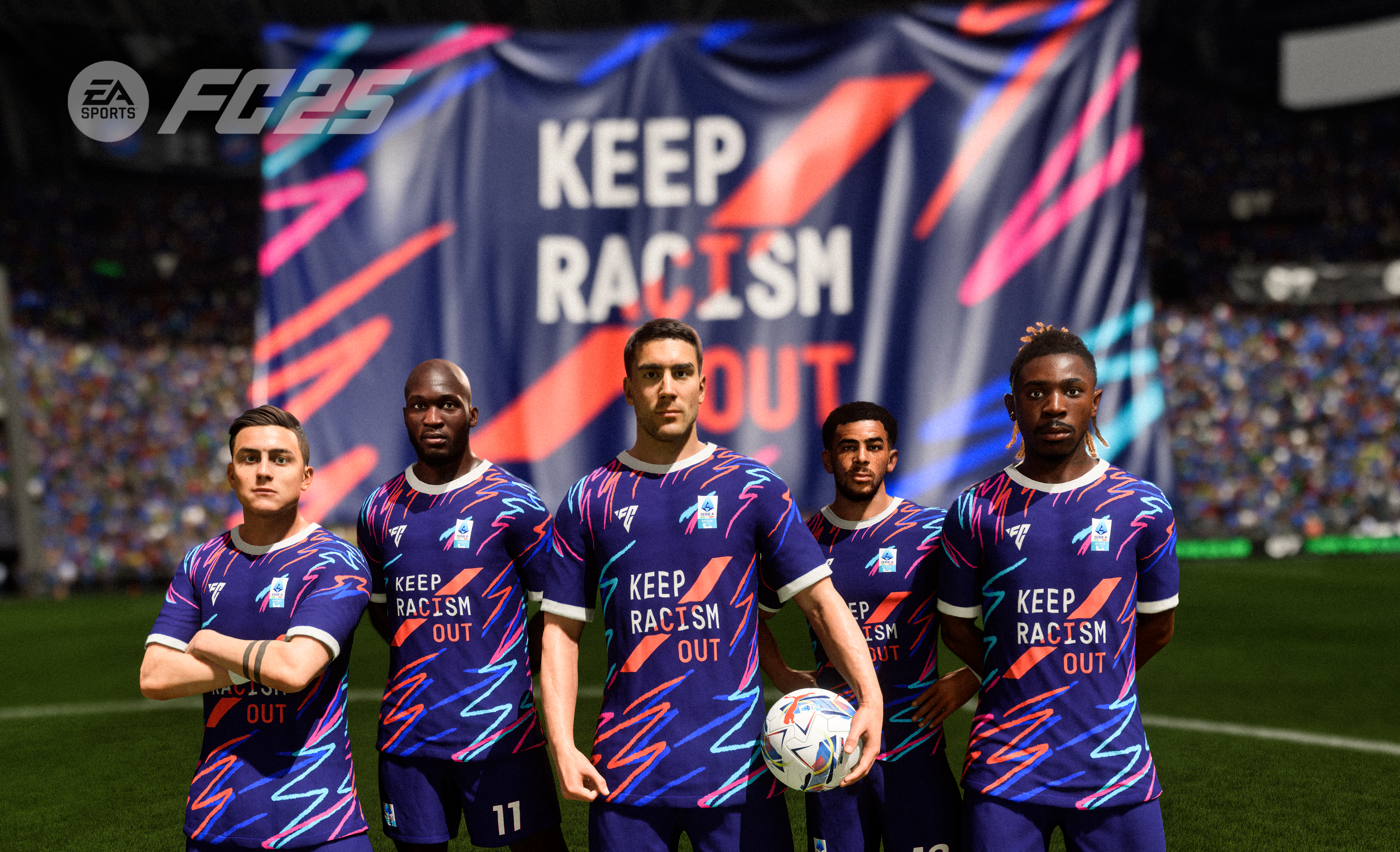 In occasione del rilancio della campagna โ€œKeep Racism Outโ€ promossa da Lega Seria A e UNAR (Ufficio Nazionale Antidiscriminazioni Razziali della Presidenza del Consiglio dei MInistri), che si occupa di sensibilizzare il pubblico contro il razzismo e ogni forma di discriminazione, anche la simulazione calcistica EA SPORTS FC 25, prederร  parte all’iniziativa, attraverso il rilascio di un kit personalizzato da sbloccare all’interno della modalitร  Football Ultimate Team (FUT). Tale kit, denominato per l’appunto “Keep Racism Out”ย รจ costituito dai colori blu scuro e azzurro della Lega Serie A, una striscia rossa sul fronte delle maglie e il logo Keep Racism Out. Questa iniziativa si inserisce perfettamente nella cornice della campagna annuale, di lunga data, di EA SPORT FC 25 per supportare la leghe partner nella lotta continua contro il razzismo.