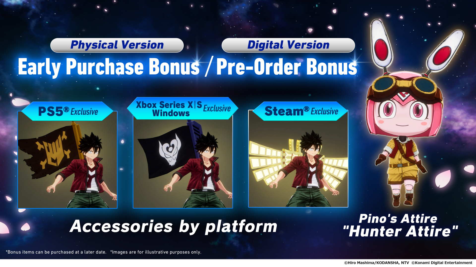 Konami ha annunciato la data di uscita per Edens Zero, in arrivo dal 15 luglio 2025 su PlayStation 5, Xbox Series e PC tramite Steam e Windows Store. Per l’occasione รจ stato pubblicato il trailer di annuncio della data ,che potete vedere in fondo alla news. Inoltre, i pre-ordini sono aperti. I bonus pre-order fisici e digitali della Day One Edition includono gli accessori e l’โ€œHunter Attireโ€ per Pino. Acquistando la Deluxe Edition digitale si avrร  diritto a 72 ore di accesso anticipato come bonus pre-ordine. Inoltre, l’edizione Deluxe fisica includerร  un set Lacrima, uno Starter Item Pack, un set di equipaggiamento Gaming (maschile) e un set di equipaggiamento Cyber (femminile).