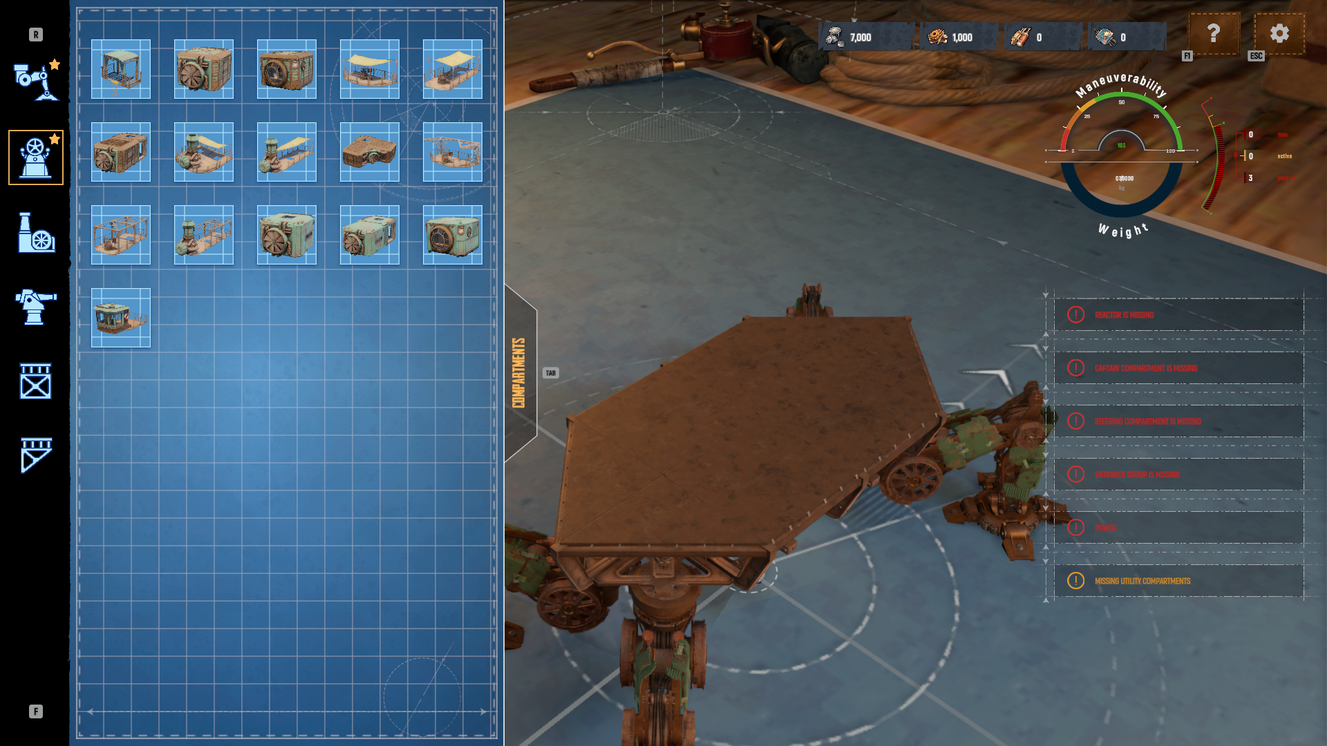 Uno degli aspetti piรน appaganti di Sand รจ senzโ€™altro lโ€™editor del walker. Tra una partita e lโ€™altra, allโ€™interno di un hangar molto essenziale, ogni Capitano ha la possibilitร  di progettare e modificare il proprio veicolo E le opzioni a disposizione sono discretamente approfondite. A esclusione delle zampe, pezzo obbligatorio e condiviso tra tutti i walker, ogni mezzo di trasporto puรฒ essere altamente personalizzato sfruttando un sistema di griglie a tre dimensioni che interagisce con componenti modulari. Si puรฒ optare per un design piรน verticale o orizzontale, decidere se privilegiare la velocitร  e lโ€™agilitร  oppure la robustezza e la capacitร  di resistere a scontri prolungati.ย