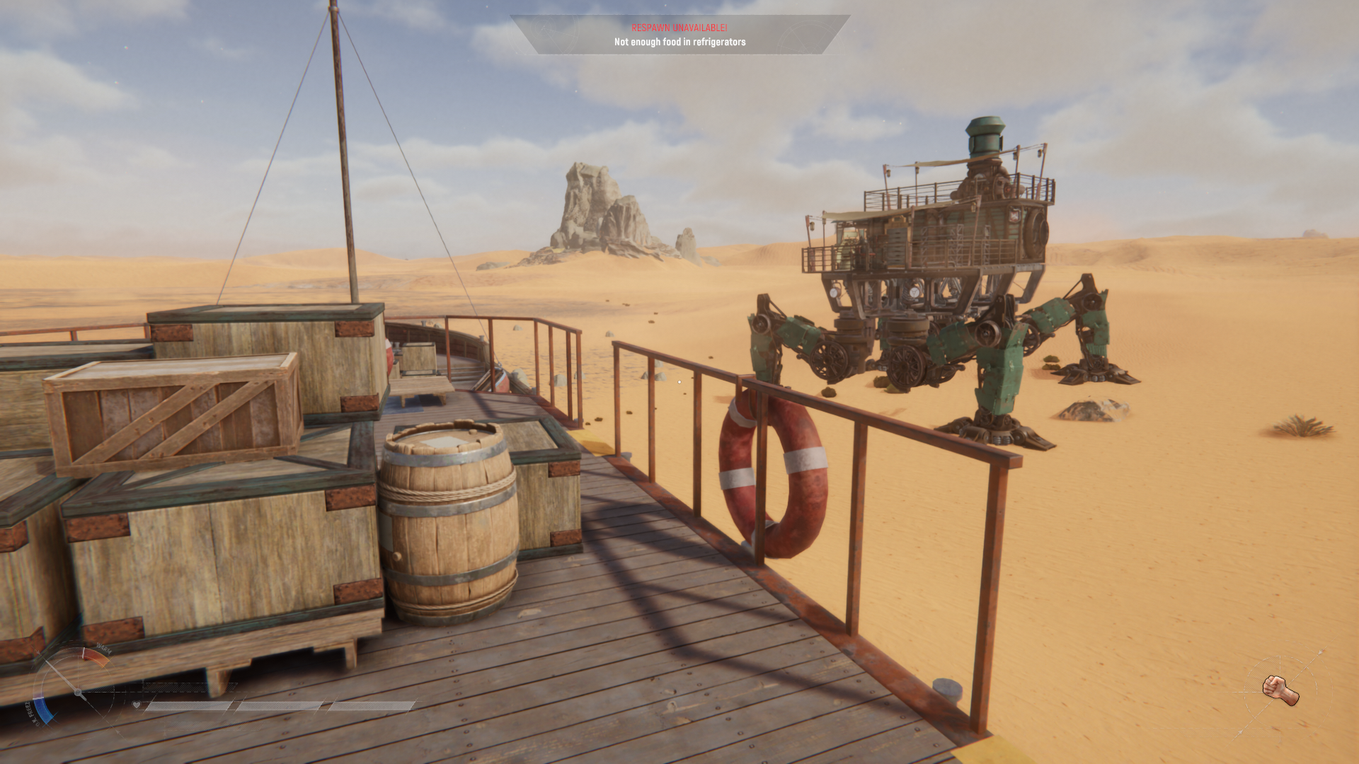 รˆ dunque evidente che Sand offre il meglio di sรฉ quando viene fruito in multiplayer assieme a compagni di squadra. In quel caso, il capitano puรฒ concentrarsi sul controllo del walker, mentre gli altri membri della ciurma si dedicano alla ricognizione con il binocolo, alla difesa del mezzo e alla riparazione degli eventuali danni subiti. La raccolta delle risorse, elemento cruciale per il progresso, premia a sua volta le strategie collaborative: lโ€™inventario personale รจ limitato, quindi รจ necessario impugnare casse o altri contenitori che siano in grado di meglio stipare il bottino. Ovviamente, con le mani impegnate, non รจ possibile difendersi da eventuali minacce, inoltre lโ€™azione di saccheggio in solitaria puรฒ dimostrarsi molto lenta e frustrante. Alle volte, perรฒ, รจ meglio essere soli che mal accompagnati.