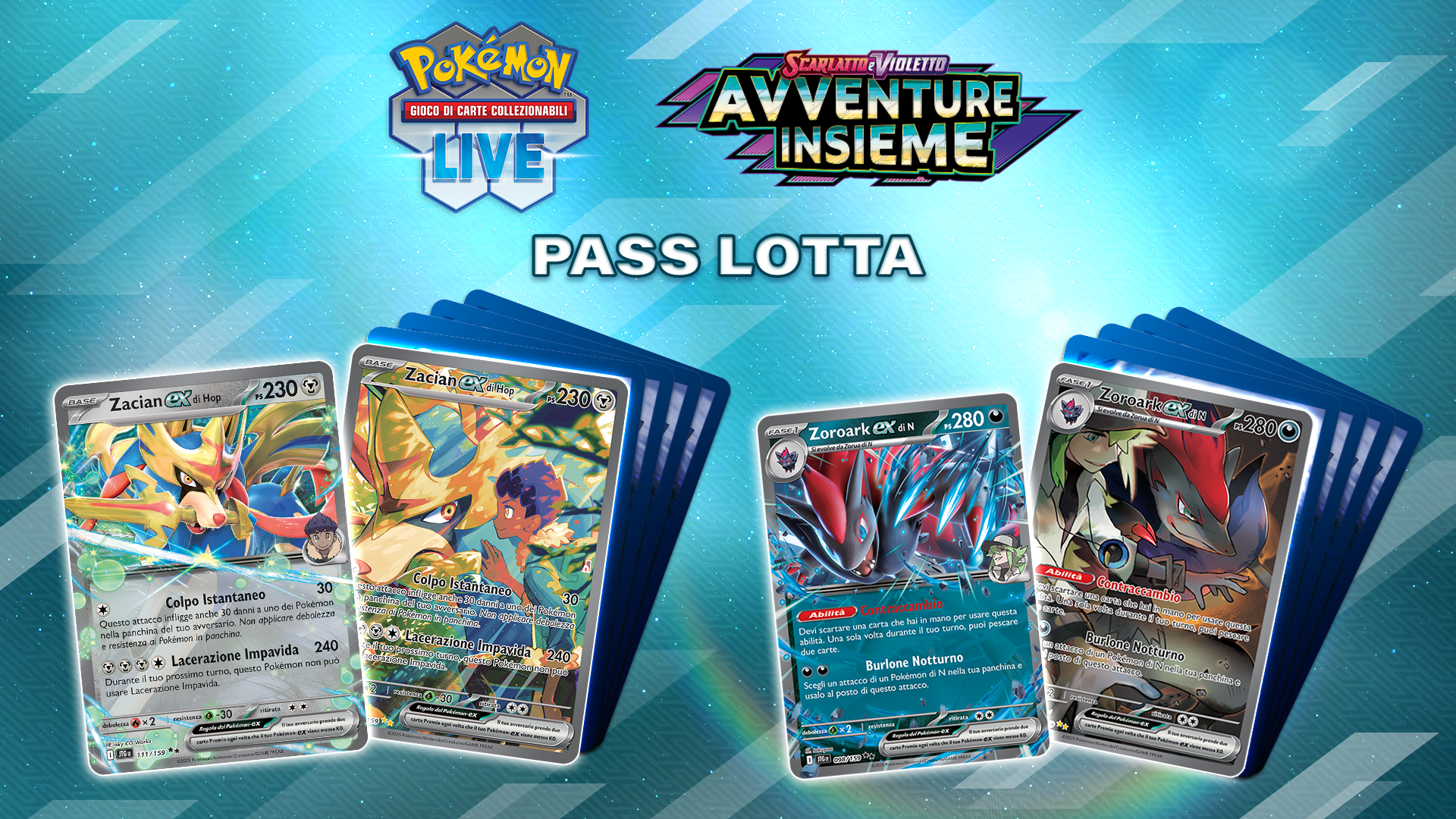 L’espansione Scarlatto e Violetto – Avventure Insieme è ora disponibile in versione digitale sull’app GCC Pokémon Live per dispositivi iOS, Android, macOS e Windows. I giocatori possono collezionare e lottare con nuove carte dedicate ai Pokémon degli Allenatori. Inoltre, sarà possibile cimentarsi nella nuova modalità di gioco Test Allenatore, che propone una serie di formati in rotazione, tra cui la Sfida del Capopalestra, per divertirsi con il GCC Pokémon in modi sempre nuovi. Maggiori informazioni sulla modalità Test Allenatore e sulla programmazione dei formati sono disponibili qui. Effettuando l’accesso, il Pass Lotta dell’espansione Scarlatto e Violetto – Avventure Insieme regalerà un nuovo mazzo Zacian-ex di Hop e sarà possibile sbloccare un mazzo aggiuntivo di Zoroark-ex di N continuando a giocare.