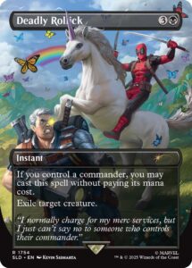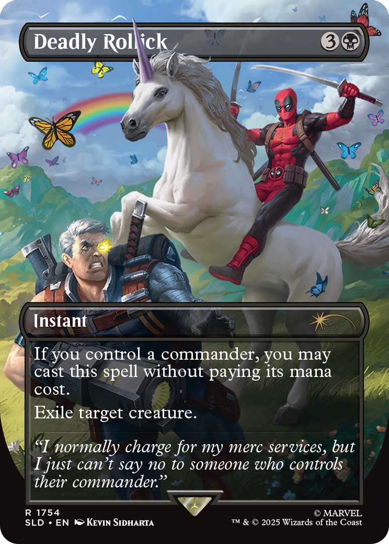 Il Mercenario chiacchierone sfonda la quarta parete dei Secret Lair per creare scompiglio. Attraverso cinque carte che stravolgono la Continuity, tra cui la nuovissima carta Deadpool, Trading Card, Wade Wilson si fa beffe di tutto ciรฒ che รจ piรน caro ai fan del gioco. I giocatori ora potranno trasformare l’antieroe nel loro prossimo comandante, se riusciranno a farlo lavorare in squadra.