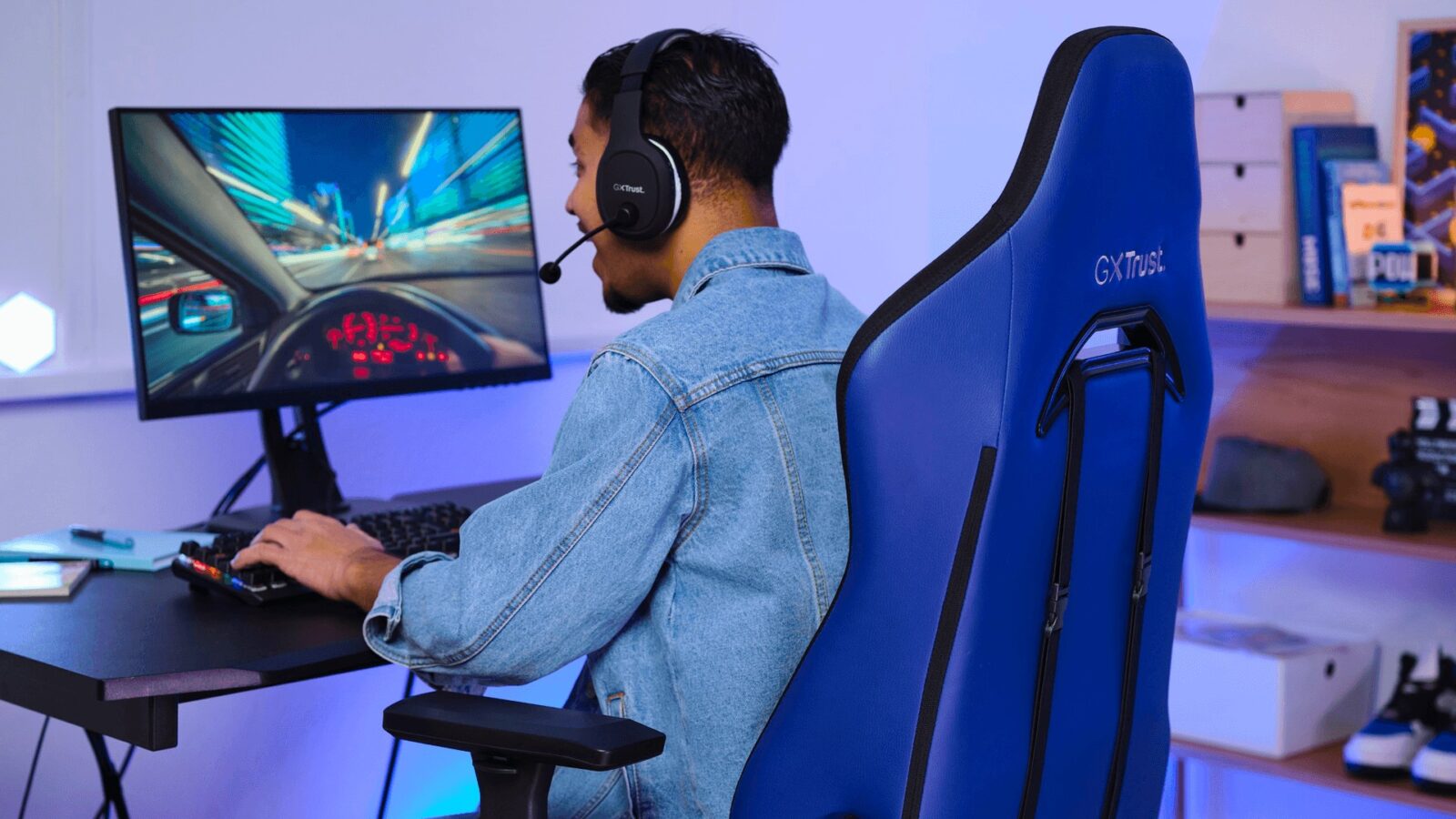 Una volta assemblata, la Ruya si è rivelata una sedia dal design accattivante, con un look da auto da corsa che strizza l’occhio agli appassionati delle livree accattivanti. Il piccolo cuscino poggiatesta, pur non essendo il massimo del lusso, offre un comfort apprezzabile durante le lunghe sessioni di gioco o lavoro. La versione che ho testato era tinta di un vivace blu royal, molto simile all’elettrico, ma Trust ha messo a disposizione altre colorazioni come un sobrio nero uniforme, un bianco classico e il rosso per chi desidera un tocco di aggressiva originalità. Dal punto di vista tecnico, la Ruya si distingue per la sua encomiabile polivalenza: la larghezza della seduta di 40 cm e il meccanismo di sollevamento a gas, che supporta fino a 150 kg, la rendono adatta a diverse corporature, mentre il supporto lombare, regolabile tramite cinghie elastiche, è un dettaglio che ho apprezzato parecchio, in quanto consente di personalizzare la seduta in base alle proprie esigenze posturali e si rivela di gran lunga più confortevole e affidabile di tanti altri analoghi. Insomma, per quanto il montaggio richieda qualche minuto, il risultato finale ripaga ampiamente lo sforzo.
