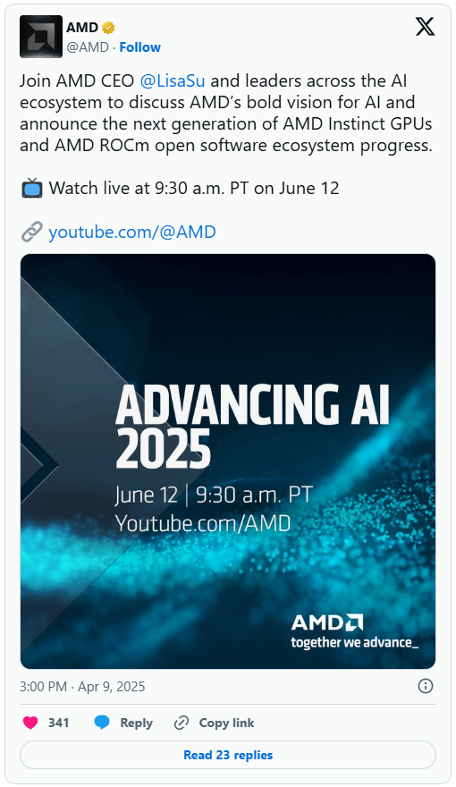Secondo quanto rivelato recentemente, AMD ha annunciato l’evento โ€œAdvancing AIโ€ di quest’anno, durante il quale il Team Red dovrebbe presentare la visione AI dell’azienda e le GPU Instinct di nuova generazione. L’evento รจ dedicato principalmente al portafoglio AI di AMD, e uno dei principali annunci che attendiamo รจ quello degli acceleratori Instinct di nuova generazione, probabilmente l’acceleratore Instinct MI355X, che sarร  il primo a sfruttare il processo a 3 nm di TSMC insieme a 288 GB di memoria HBM3E. Oltre a questo, il Team Red dovrebbe anche fornire un resoconto della sua linea di AI Instinct MI400 di prossima generazione, che si dice sarร  rivoluzionaria in termini di prestazioni computazionali.