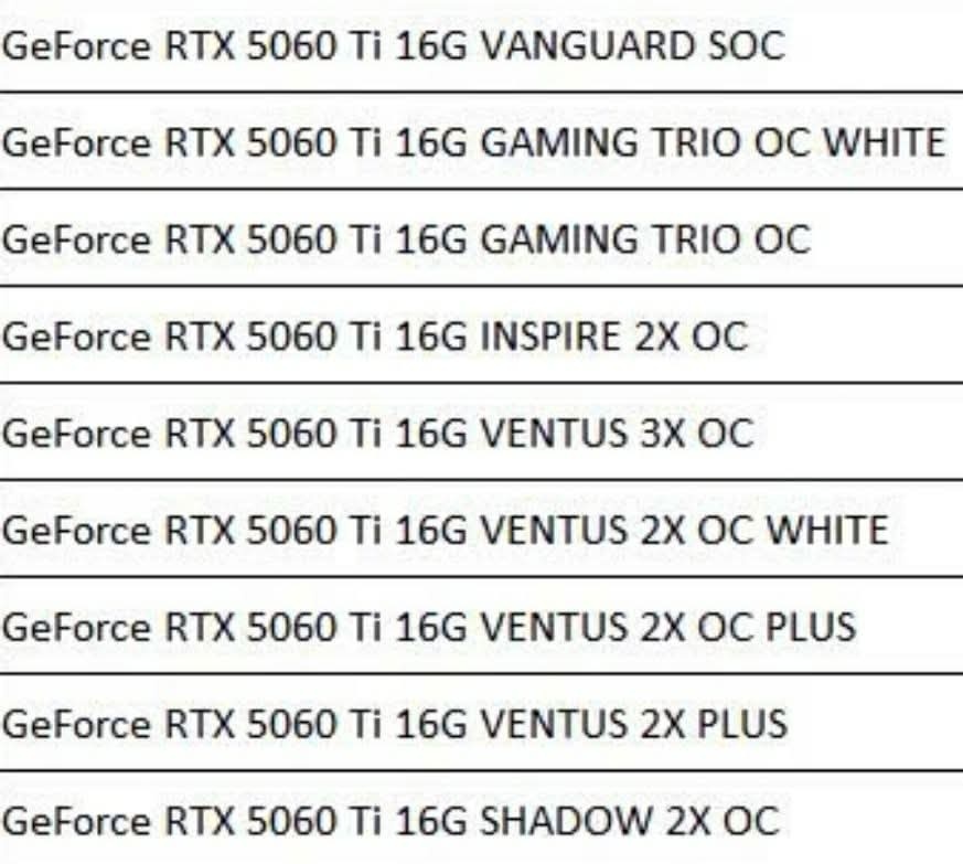 Allo stesso modo, Gigabyte ha registrato diversi modelli di GeForce RTX 5060 Ti, tra cui le edizioni Gaming, AERO, AORUS, WindForce e Eagle. Sono state registrate ben sette schede RTX 5060 Ti e tutte sono varianti da 16 GB. Anche MSI ha preparato nove varianti della RTX 5060 Ti, tutte da 16 GB. Non abbiamo ancora visto le edizioni da 8 GB, ma considerando che verranno lanciate lo stesso giorno della scheda da 16 GB, รจ probabile che gli AIB abbiano preparato anche queste.