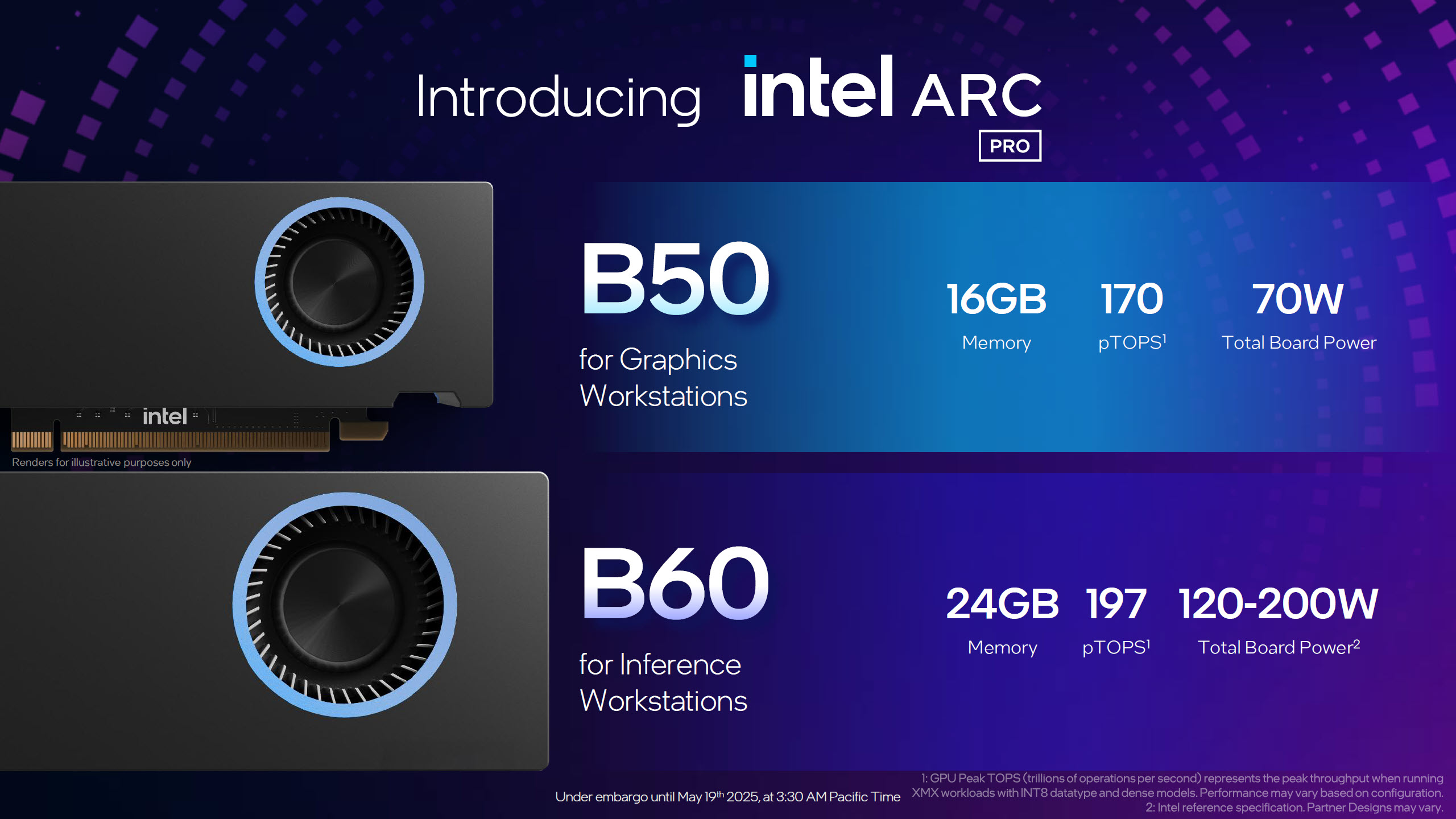 I modelli Intel Arc Pro B60 e Arc Pro B50 saranno disponibili nel terzo trimestre di quest’anno. Le schede saranno fornite all’interno dei sistemi dei principali produttori di workstation, ma ci รจ stato anche comunicato che un lancio “fai da te” potrebbe avvenire al termine del lavoro di ottimizzazione software, intorno al quarto trimestre. Per quanto riguarda il prezzo, l’Arc Pro B50 avrร  un prezzo consigliato di 299 dollari USA, mentre l’Arc Pro B60 si aggirerร  intorno ai 500 dollari USA, con sistemi che si aggirano intorno ai 5000 dollari USA.