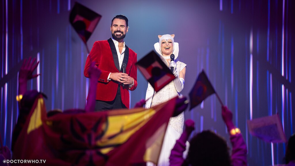 Mentre si esibiscono i cantanti alieni ci si rende conto di una incredibile combinazione, la puntata viene resa disponibile in data Sabato 17 Maggio 2025. Si, esattamente in concomitanza con una manifestazione omologa reale ed attuale, ovvero Euro Vision Song Contest, come anticipato nel cappello della recensione, festival seguitissimo in tutta Europa, a cui partecipa per altro anche il Regno Unito. La trovata è davvero geniale, ed unisce la sci-fi di base della serie alla realtà contemporanea di tutti i giorni. A legare ulteriormente gli universi della fantasia con quello della realtà c’è poi la presenza di due notevoli guest star. Stiamo parlando innanzitutto del presentatore del festival fittizio Interstellar Song Contest, che altri non è che un grande personaggio del passato terrestre, tenuto sotto ghiaccio in ibernazione criogenica, Rylan, che è realmente un personaggio TV noto in tutta Europa, ed interpreta sé stesso. L’idea è presa pari pari da Futurama, obietteranno i più esperti cultori di sci-fi all’ascolto, ma è coerente e molto divertente. Ma non solo, sotto forma di ologramma nel museo annesso alla struttura spaziale che ospita il festival compare persino il leggendario Graham Norton, comico irlandese attivo fin dagli anni novanta, magari poco noto in Italia, ma che è una vera istituzione in Gran Bretagna. Si tratta infatti del commentatore ufficiale per la BBC del reale Euro Vision Song Contest fin dai primi anni duemila, che ha partecipato anche al film sul festival del 2020 intitolato Euro Vision Song Contest: La Storia dei Fire Saga e diretto da David Dobkin. Oltre a loro ci sono anche due eccezionali ritorni di personaggi della cosiddetta Serie Classica, di cui ovviamente non vi faremo alcuno spoiler, ma che sapranno emozionare i fan di vecchia data!