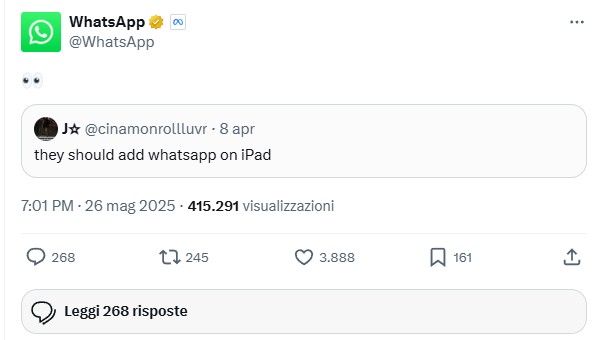 Secondo quanto annunciato recentemente, WhatsApp รจ sempre stata riluttante a lanciare un’app dedicata per iPad o tablet con schermi piรน grandi, principalmente perchรฉ si basava sui numeri di telefono per la verifica. Tuttavia, l’azienda ha superato le sue preoccupazioni lanciando un’app che puรฒ essere utilizzata come complemento all’app principale. Ora, l’azienda ha finalmente presentato un’app per iPad, che potrebbe arrivare agli utenti prima del previsto. Questo ci porta alle indiscrezioni sull’app di WhatsApp per tablet. L’azienda sta cercando di introdurre un’app dedicata per iPad, che funzionerร  insieme alle app per iPhone e Mac. Oggi, l’account ufficiale di WhatsApp su X ha reagito con un’emoji a forma di occhi a un post che menzionava il lancio di un’app per iPad da parte dell’azienda. La reazione รจ un’indicazione o un suggerimento, che suggerisce che Meta, la societร  madre di WhatsApp, stia pianificando di rilasciare un’app dedicata per iPad.