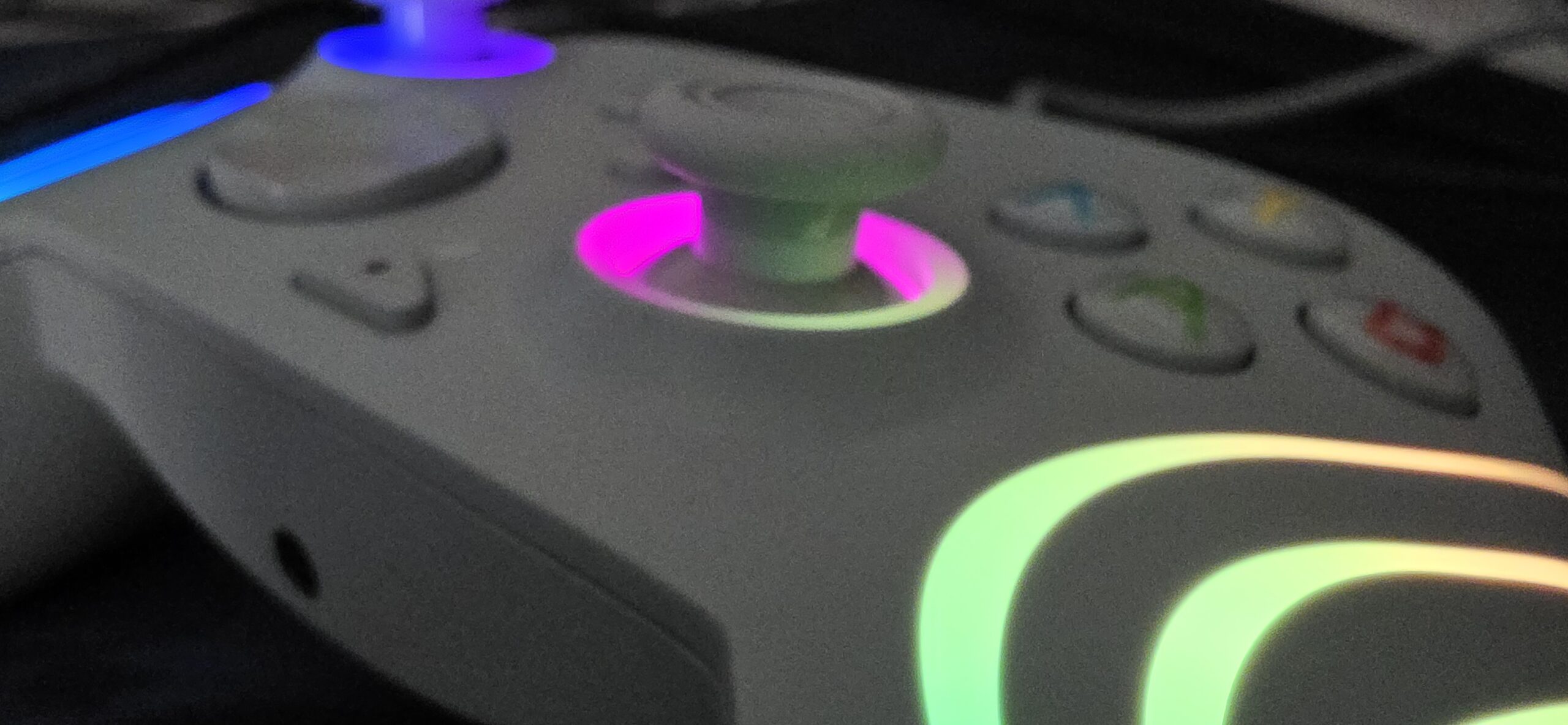 L’Afterglow Wave non è un controller che si mimetizza nell’ombra ma, al contrario, è stato progettato per catturare l’attenzione. Disponibile in cinque colori vivaci (bianco, nero, blu, viola e grigio), sfoggia un tocco di personalizzazione visiva che va oltre le classiche tonalità a tinta unita che dominano il mercato. Ma il vero protagonista del suo design è senza dubbio l’illuminazione RGB: non sto parlando di una semplice luce di stato, bensì di un sistema sofisticato con ben otto zone RGB personalizzabili , una caratteristica trasforma il controller in un vero e proprio ornamento del nostro setup da gaming, permettendo di sincronizzarlo con l’atmosfera della postazione in cui ci accomodiamo o semplicemente di esprimere lo stile particolare che ci identifica. L’effetto è dinamico e coinvolgente, specie in ambienti poco illuminati, dove le sfumature di colore danzano attraverso la scocca trasparente. La qualità percepita dei materiali, nonostante il prezzo relativamente contenuto, è notevole e molto lontana da quella di un prodotto economico; al contrario, la qualità costruttiva suggerisce compattezza e una certa resistenza, aspetti fondamentali per un dispositivo destinato a sopportare ore di sessioni intense. La sensazione di solidità è rassicurante, confermando l’attenzione di Turtle Beach non solo all’estetica ma anche alla qualità costruttiva.