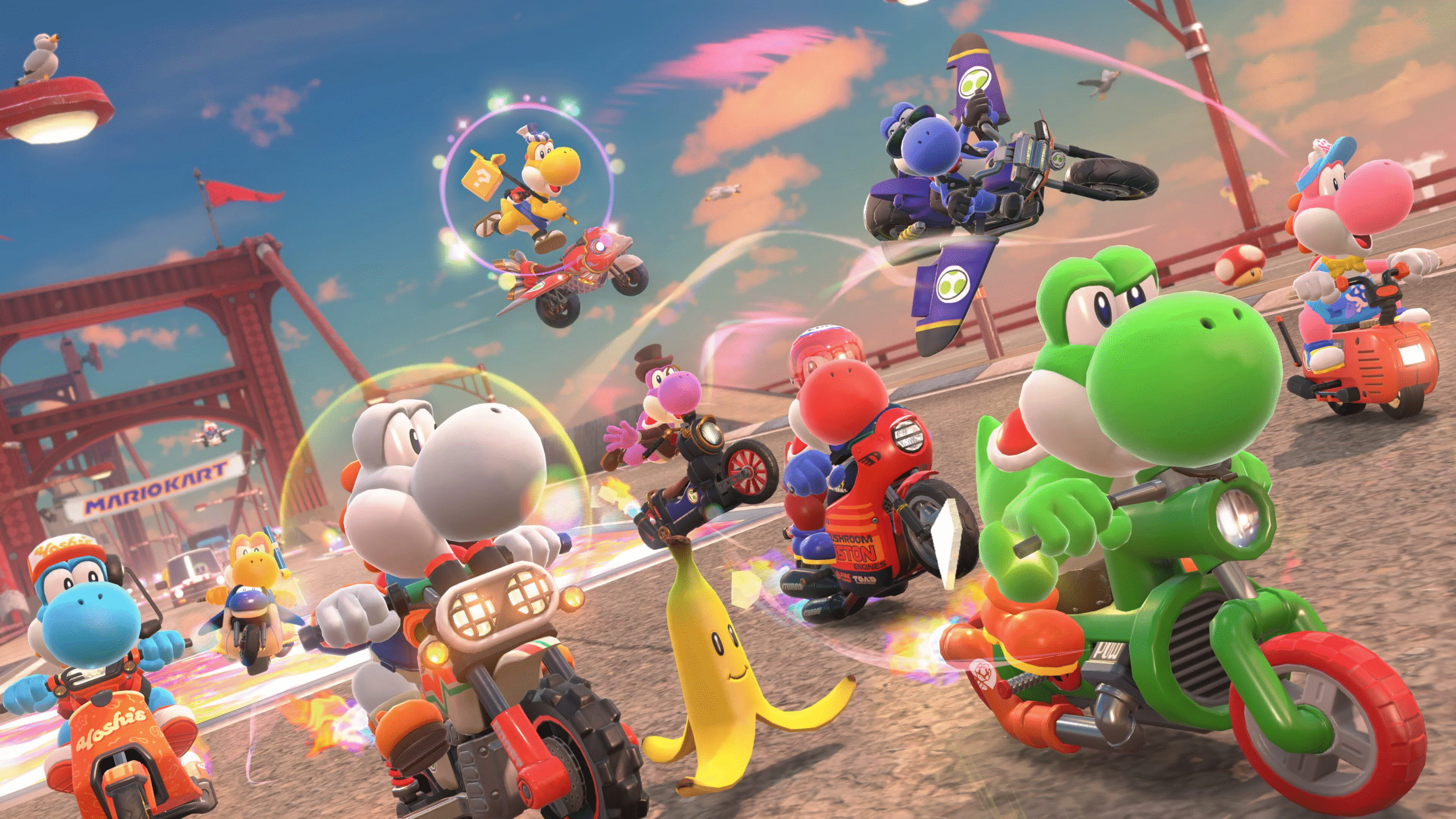 Come abbiamo avuto modo di vedere durante i vari trailer del gioco, piuttosto che inventarsi una nuova gimmick folle come l’anti-gravità Mario Kart World preferisce rimanere entro i limiti delle leggi del buon Newton, scegliendo di sviluppare il modello di guida verso una dimensione verticale esplorando le potenzialità dei trick aerei. Quelli che in passato non erano altro che dei modi per ottenere un leggero boost dopo aver utilizzato una rampa per elevarsi in volo, in Mario Kart World assumono tutta un’altra dimensione grazie al grinding effettuabile su rotaie, tralicci e guard rail, la già citata Piuma e il salto caricato. Se a questo aggiungiamo una fisica che gode nell’uso di queste meccaniche per guadagnare sempre più “momentum”, il risultato è una velocità di gioco che a 150cc trasforma le corse in massacri che farebbero impallidire gli animatori di Wacky Races. Il tutto raggiunge una nuova ed eccitante prospettiva nel momento in cui il wallriding entra nella strategia di gioco predominante, permettendo ai giocatori più esperti di tirare fuori scoricatoie folli, bruciando record su record e mostrando al mondo le incredibili potenzialità di questo modello di guida.