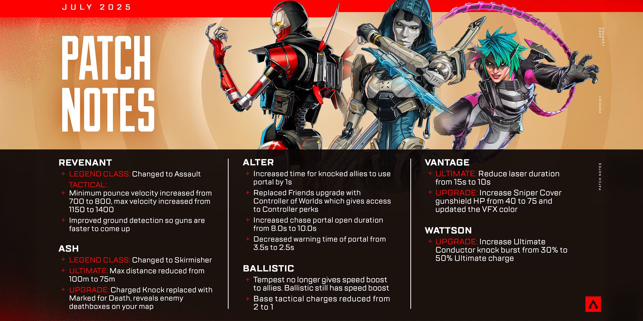 Per Ballistic, Respawn ha deciso di rimuovere la possibilità di aumentare la velocità degli alleati tramite Tempest, riducendo inoltre le cariche tattiche da due a una. Ritocchi minori anche per Vantage e Wattson.