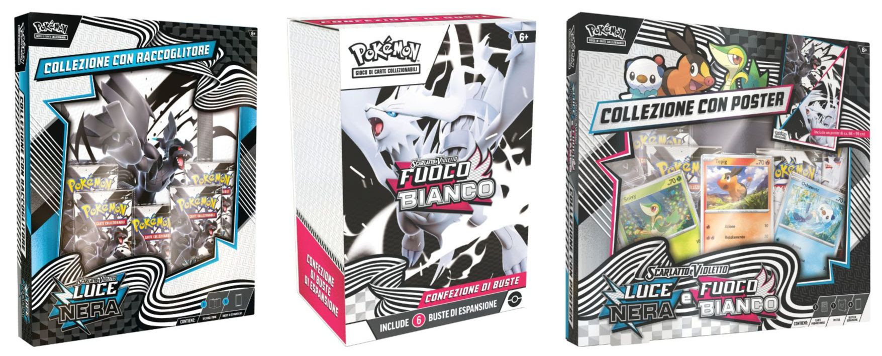A rappresentare le due espansioni troviamo i leggendari Zekrom, protagonista di Luce Nera, e Reshiram, volto di Fuoco Bianco. Entrambe offrono reinterpretazioni illustrate dei Pokémon più iconici della quinta generazione, con nuove varianti da collezione.