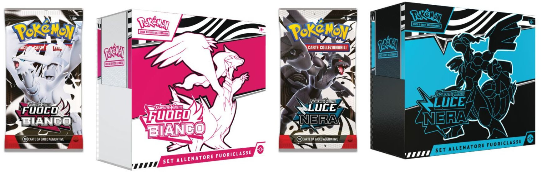 • Set Allenatore Fuoriclasse dell’espansione Scarlatto e Violetto – Luce Nera o Scarlatto e Violetto – Fuoco Bianco, che include nove buste dell’espansione Scarlatto e Violetto – Luce Nera o dell’espansione Scarlatto e Violetto – Fuoco Bianco, una carta promozionale in stile rara illustrazione di Thundurus o Tornadus, oltre a vari accessori di gioco.