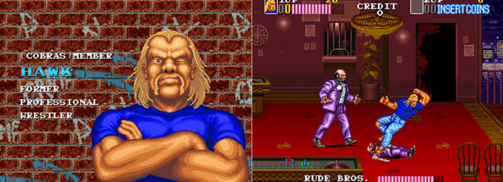 Sontuosa risposta griffata Konami a classici  quali Final Fight (1989, Capcom) e Double Dragon (1987, Technos Jap.), Vendetta non sarebbe passato alla storia soltanto come uno dei migliori beat ‘em up a gettoni della sua epoca, ma anche per aver introdotto il possente Hawk tra i cinque protagonisti selezionabili. Presentato come un ex-wrestler professionista dedicatosi alla lotta contro il crimine negli anni del pensionamento, questo personaggio costituiva un palese omaggio al mito di Hulk Hogan: al di là delle ovvie analogie estetiche, gran parte dei colpi a sua disposizione ne rievocavano peraltro il classico repertorio.
