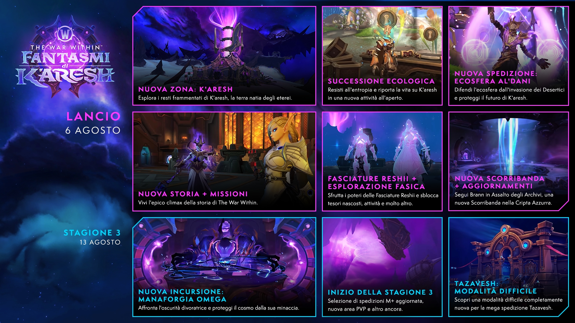 • Nota: tutte le spedizioni della Stagione 3 di World of Warcraft The War Within sono disponibili da oggi in modalità Normale, Eroica e Mitica 0; la modalità Mitica+ sarà disponibile a partire dal 12 agosto.