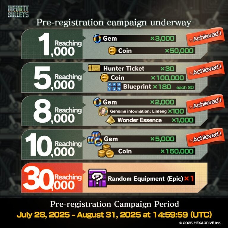 Per festeggiare il superamento delle 10.000 pre-registrazioni, HEXADRIVE regala a tutti i giocatori un pacchetto ricchissimo di bonus: ben 10.000 Gemme, 300.000 monete, 30 Hunter Tickets, 1.000 Wonder Essences e 180 progetti di potenziamento equipaggiamento. Un bottino perfetto per partire con il piede giusto.