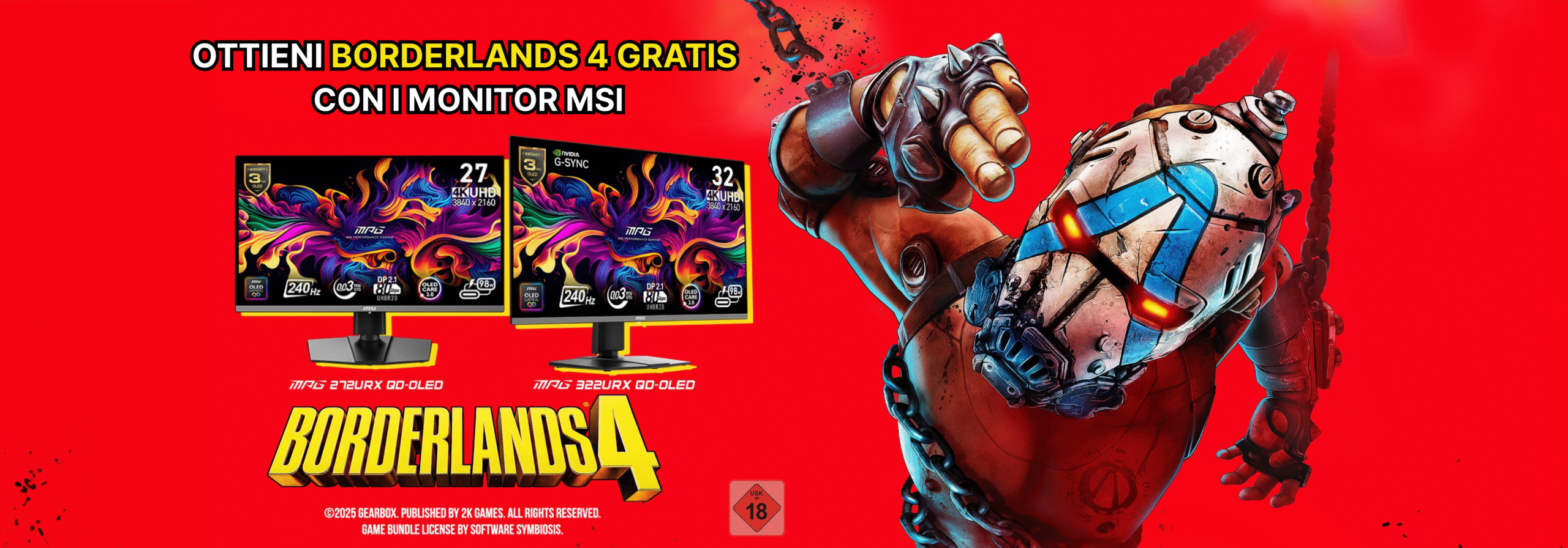 Per festeggiare l’arrivo sul mercato diย Borderlands 4ย MSI annuncia oggi una nuova promozione: quanti acquisterannoย entro il 12ย ottobre uno deiย monitor gaming MSI QD-OLED o 4Kย selezionati per l’iniziativa riceveranno un codice del nuovo gioco sviluppato da Gearbox Software. Sarร  sufficiente acquistare un prodotto idoneo e quindi registrarlo tramite ilย Member Center MSI,ย caricando la documentazione richiesta, per ricevere un codice di gioco daย riscattare su Steam entro il 26 ottobreย (o fino a esaurimento scorte).